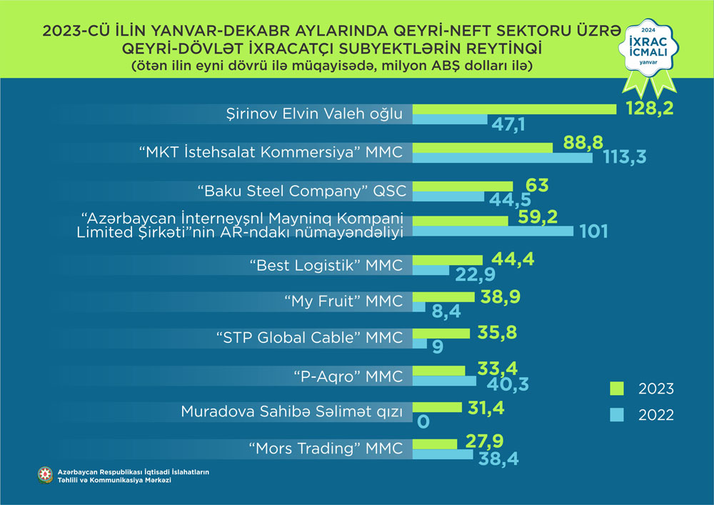 2023-cü ilin yanvar-dekabr ayları üzrə hazırlanan qeyri-dövlət ixracatçı subyektlərin reytinqində ilk onluqda aşağıdakı şirkətlər təmsil olunurlar: Şirinov Elvin Valeh oğlu, “MKT İstehsalat Kommersiya” MMC, “Baku Steel Company” QSC, “Azərbaycan İnterneyşnl Mayninq Kompani Limited Şirkəti”nin Azərbaycan Respublikasındakı Nümayəndəliyi, “Best Logistik” MMC, “My Fruit” MMC, “STP Global Cable” MMC, “P-Aqro” MMC, Muradova Sahibə Səlimət qızı, “Mors Trading” MMC.