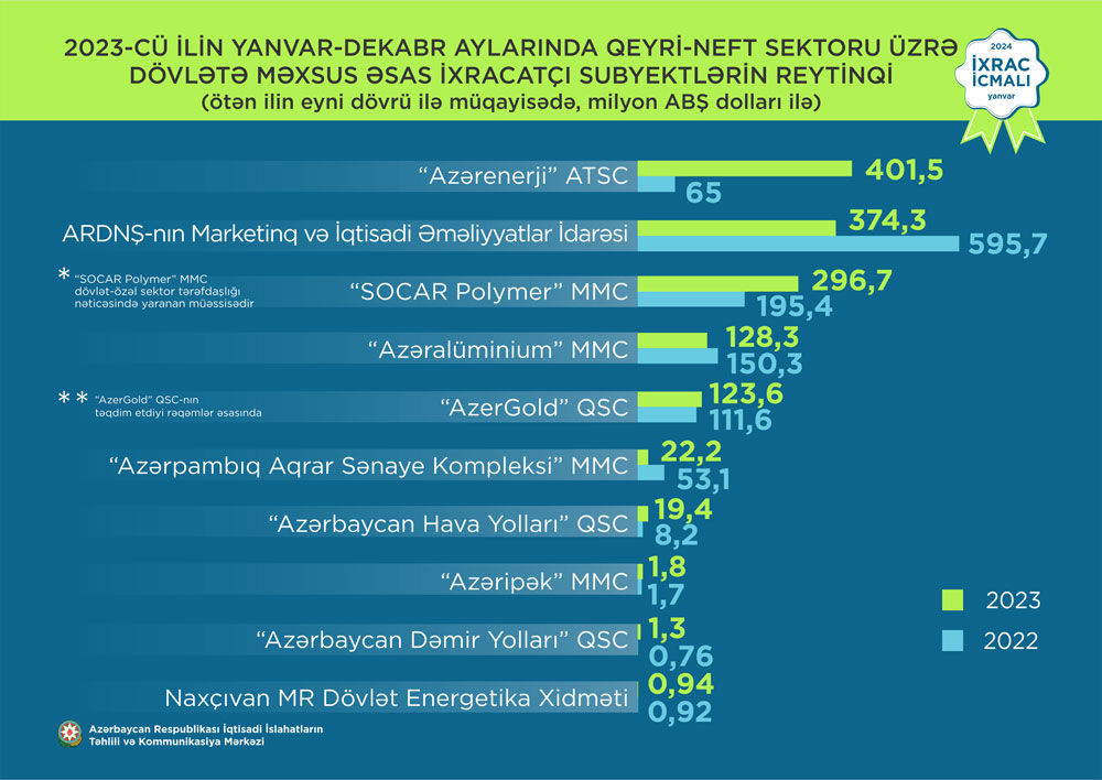 “İxrac icmalı” tərəfindən qeyri-neft sektoru üzrə 2023-cü ilin yanvar-dekabr aylarında həyata keçirilən ixracla bağlı həm qeyri-dövlət, həm də dövlətə məxsus ixracatçı subyektlərin reytinqi tərtib edilib.