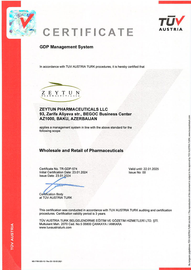 Qeyd edək ki, "ZEYTUN PHARMACEUTICALS" Azərbaycan əczaçılıq sektorunda Beynəlxalq GDP sertifikatına sahib olan ilk təşkilatdır.