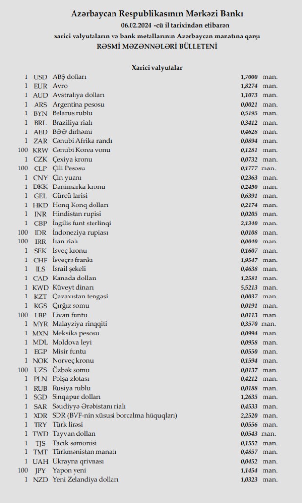 Rəsmi məzənnələr açıqlandı