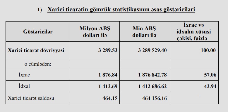 Marja.az Dövlət Gömrük Komitəsinə istinadən xəbər verir ki, o cümlədən ixrac 1 milyard 843 milyon 977 min ABŞ dolları, idxal 1 milyard 142 milyon 116 min ABŞ dolları təşkil edib. Nəticədə ticarət saldosu 701 milyon 861 min ABŞ dolları olub.