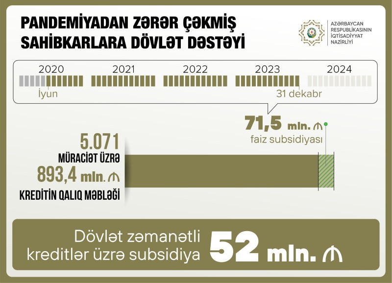Pandemiyadan zərər çəkən sahibkarlara dövlət döstəyi çərçivəsində 31 dekabr 2023-cü il tarixinə kreditin qalıq məbləği 893,4 milyon olan 5071 müraciət üzrə 71,5 milyon manat faiz subsidiyası ödənilib.