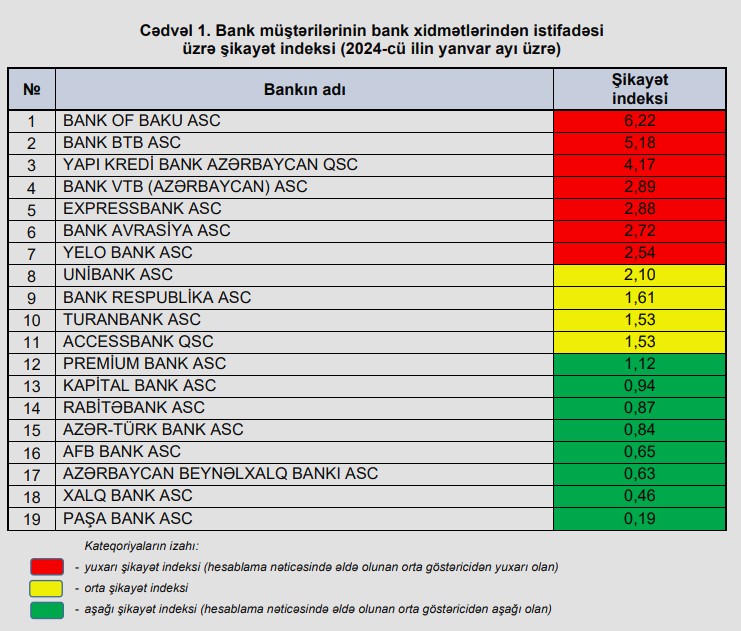 Orta şikayət indeksində isə "AccessBank", "Turanbank", "Bank Respublika" və "Unibank" yer alıb.