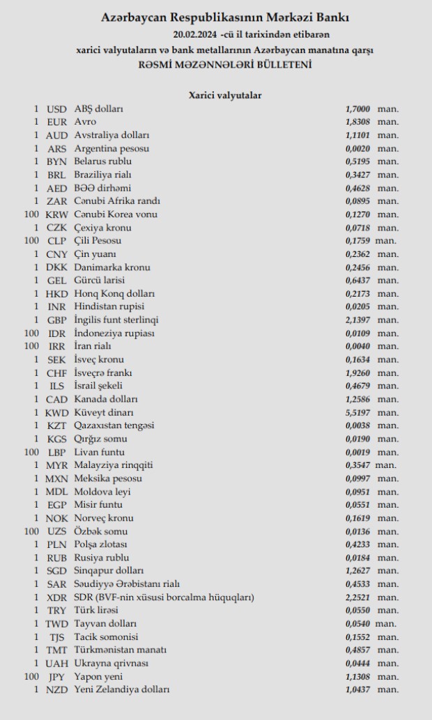 Rəsmi məzənnələr açıqlandı
