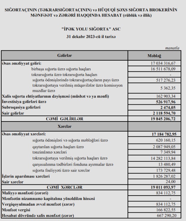 "İpək Yolu Sığorta" ASC 2023-cü ili 667 min manat xalis mənfəət ilə başa vurub. Şirkət 2022-ci ili 913 min manat xalis mənfəət ilə bağlamışdı. Beləliklə, ötən il "İpək Yolu Sığorta"nın xalis mənfəəti 246 min manat və ya 26,9% azalıb. Xalis mənfəətin azalması ehtiyatlara ayırma, yığımların azalması və ödəniş xərclərinin artması ilə əlaqədardır.