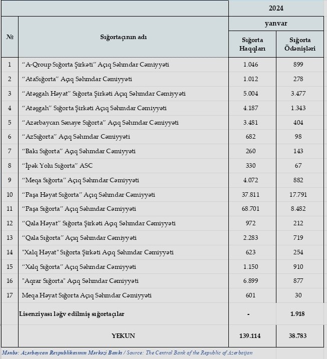 2024-cü ilin yanvar ayında Azərbaycandakı 17 sığorta şirkəti tərəfindən 139 milyon 114 min manat sığorta haqları hesablanıb və 38 milyon 783 min manat sığorta ödənişləri həyata keçirilib.