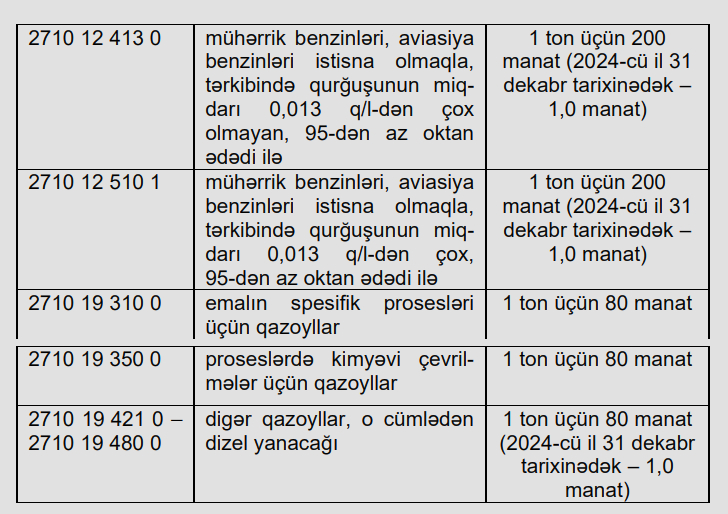 Dəyişikliyə əsasən, 2024-cü il 31 dekabr tarixinədək ölkəyə idxal edilən 95-dən az oktan ədədi ilə benzin üçün aksiz dərəcələri azaldılıb, 1 ton üçün 200 manatdan 1 manata endirilib.