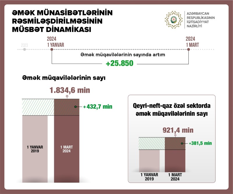 "İş yerlərinin rəsmiləşdirilməsinin təmin edilməsi istiqamətində islahatın başladığı 2019-cu ildən indiyədək işçilərlə işəgötürənlər arasında bağlanmış əmək müqavilələrinin sayı 432 mindən çox, qeyri-neft-qaz sektorunun özəl bölməsində isə 381 mindən çox artıb".