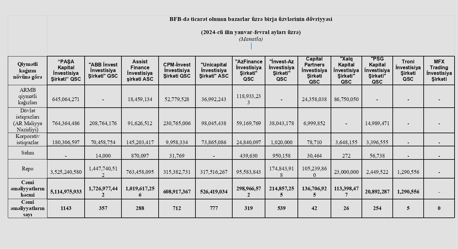 2024-cü ilin yanvar-fevral ayları üzrə Bakı Fond Birjasında (BFB) ticarət olunan bazarlar üzrə birja üzvlərinin dövriyyələri açıqlanıb.