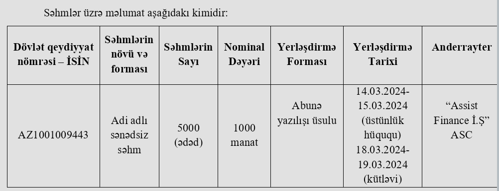 Yerləşdirmə uğurla yekunlaşarsa Bankın nizamnamə kapital 71 milyon 450 min manata yüksələcəkdir.