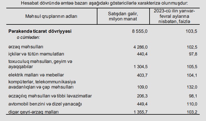 Dövlət Statistika Komitəsinin yaydığı məlumata görə, 2023-cü ilin yanvar-fevral ayları ilə müqayisədə pərakəndə ticarət dövriyyəsi real ifadədə 3,5 faiz, o cümlədən ərzaq məhsulları, içkilər və tütün məmulatları üzrə 2,1 faiz, qeyri-ərzaq malları üzrə 5,2 faiz artmışdır.
