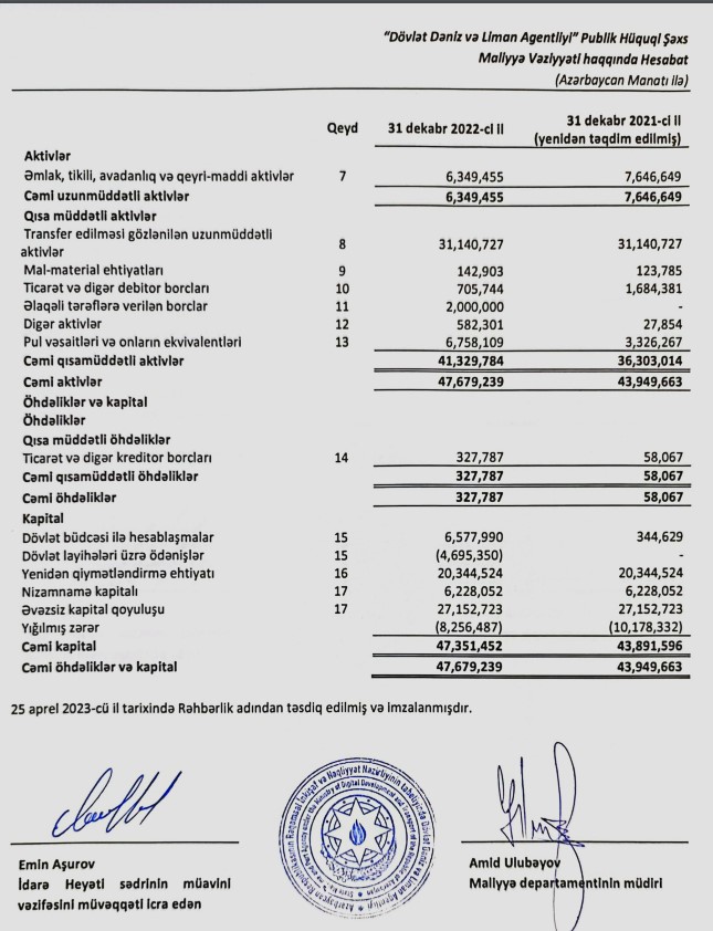 Dövlət Dəniz və Liman Agentliyi 2022-ci ildə əldə etdiyi digər gəlirlər və əməliyyat xərclərinin azaldılması hesabına zərərdən mənfəətə keçib.