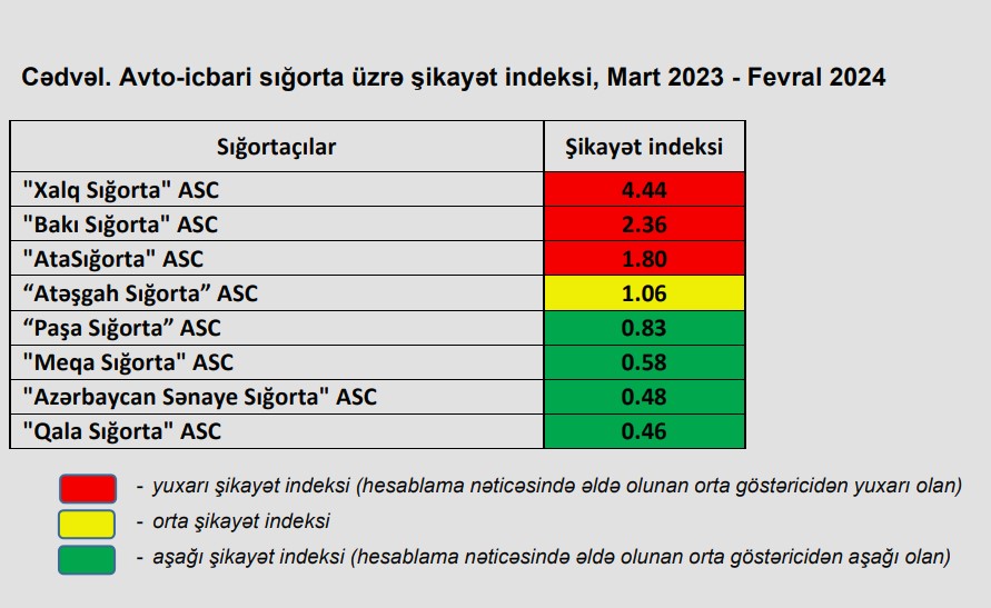 Orta şikayәt indeksində “Atəşgah Sığorta” ASC, aşağı şikayәt indeksində “Paşa Sığorta” ASC, "Meqa Sığorta" ASC, "Azərbaycan Sənaye Sığorta" ASC və "Qala Sığorta" ASC qərarlaşıblar.