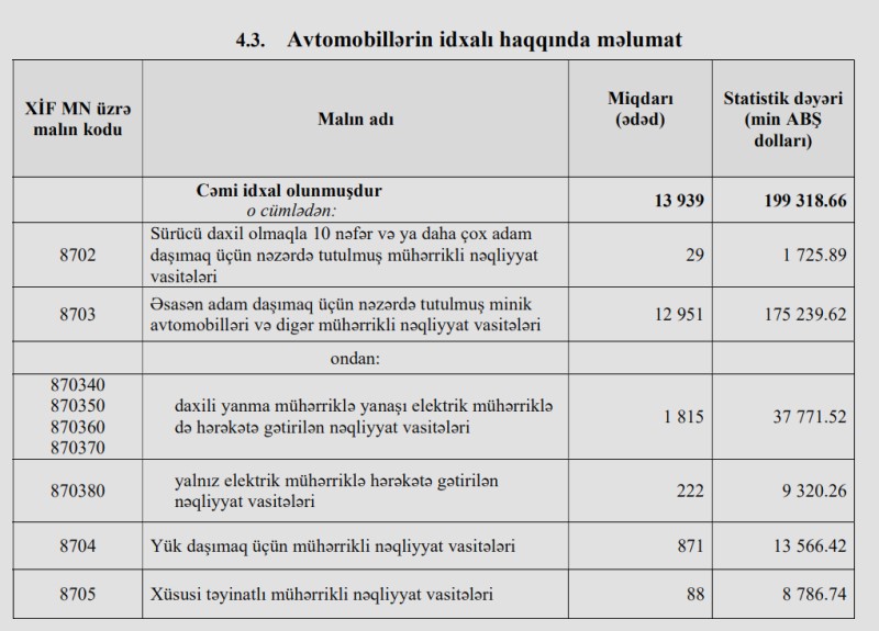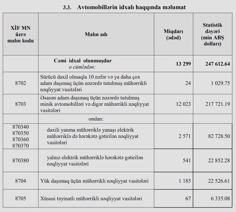 2024-cü ilin ilk 2 ayında (yanvar-fevral) Azərbaycana 247 milyon 612 min dollar dəyərində 13 min 299 ədəd nəqliyyat vasitəsi (avtomobil) idxal olunub.