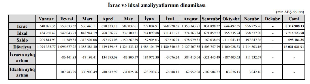 İxrac yanvarda 811 milyon 486.79 min dollar, Fevralda 914 milyon 540.41 min dollar, Martda 879 milyon 804.05 min dollar, Apreldə 941 milyon 578.29 min dollar, Mayda 902 milyon 694.25 min dollar, İyunda 818 milyon 654.73 min dolla, İyunda 883 milyon 603.52 min dollar təşkil edib.