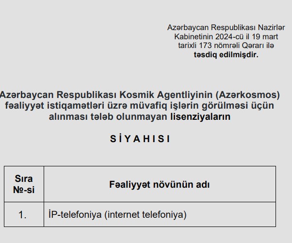 Marja.az xəbər verir ki, Siyahıya İP-telefoniya (internet telefoniya) fəaliyyət növü daxildir.