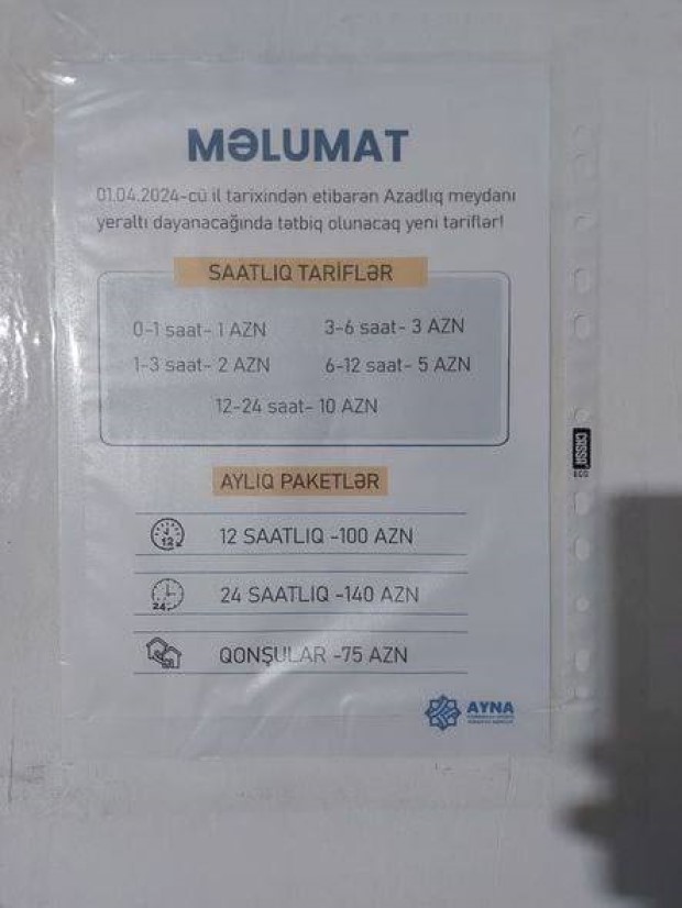 Məlumata görə, 0-1 saat üçün 1 AZN, 1-3 saat üçün 2 AZN, 3-6 saat üçün 3 AZN, 6-12 saat üçün 5 AZN, 12-24 saat üçün 10 AZN ödəniş tələb