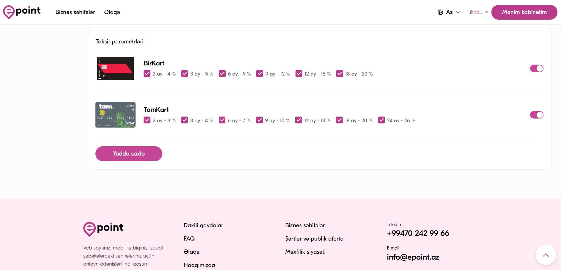 Epoint Inc. elektron ticarət ilə məşğul olan biznes sahibləri üçün vahid bir platforma üzərindən, bazarda olan bütün taksitli kredit kartlarını birləşdirən satış həllini təqdim edir. Epoint platforması üzərindən, istənilən məhsulu və ya xidməti taksitli kredit kartları vasitəsi ilə aylara bölərək müştərilərə satış etmək mümkündür. Bunun üçün Epoint müştəriləri şəxsi kabinetlərində təqdim olunan kartlar üzrə kredit müddətini seçərək müştəriləri üçün anında xidməti təqdim edə bilərlər.