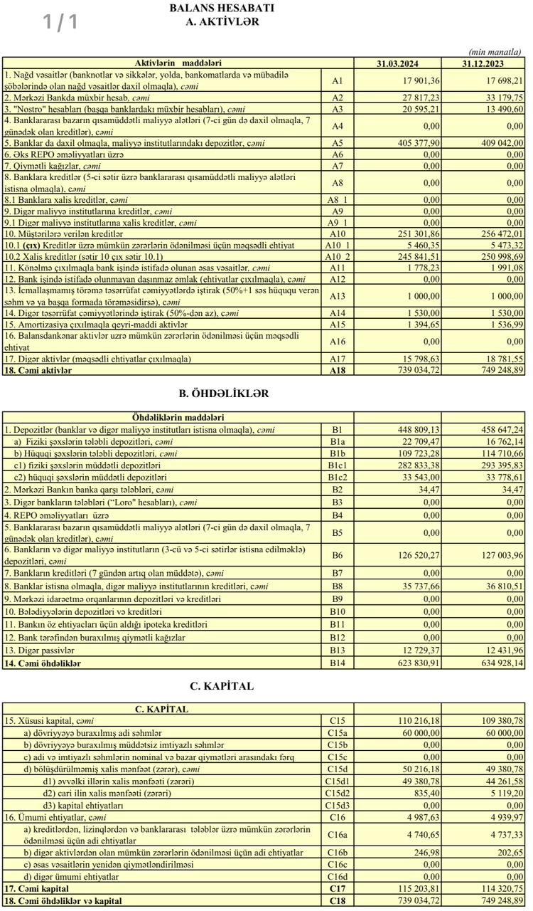 "Azərbaycan Sənaye Bankı" ASC 2024-cü ilin 1-ci rübünü (yanvar-mart) 835 min manat xalis mənfəət ilə başa vurub.