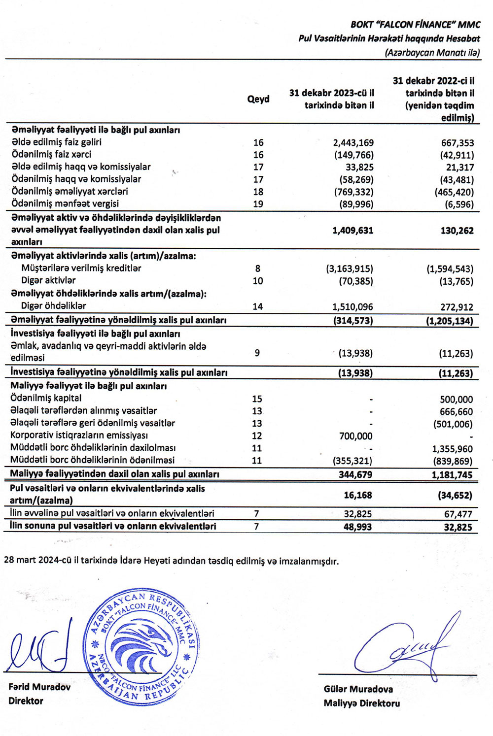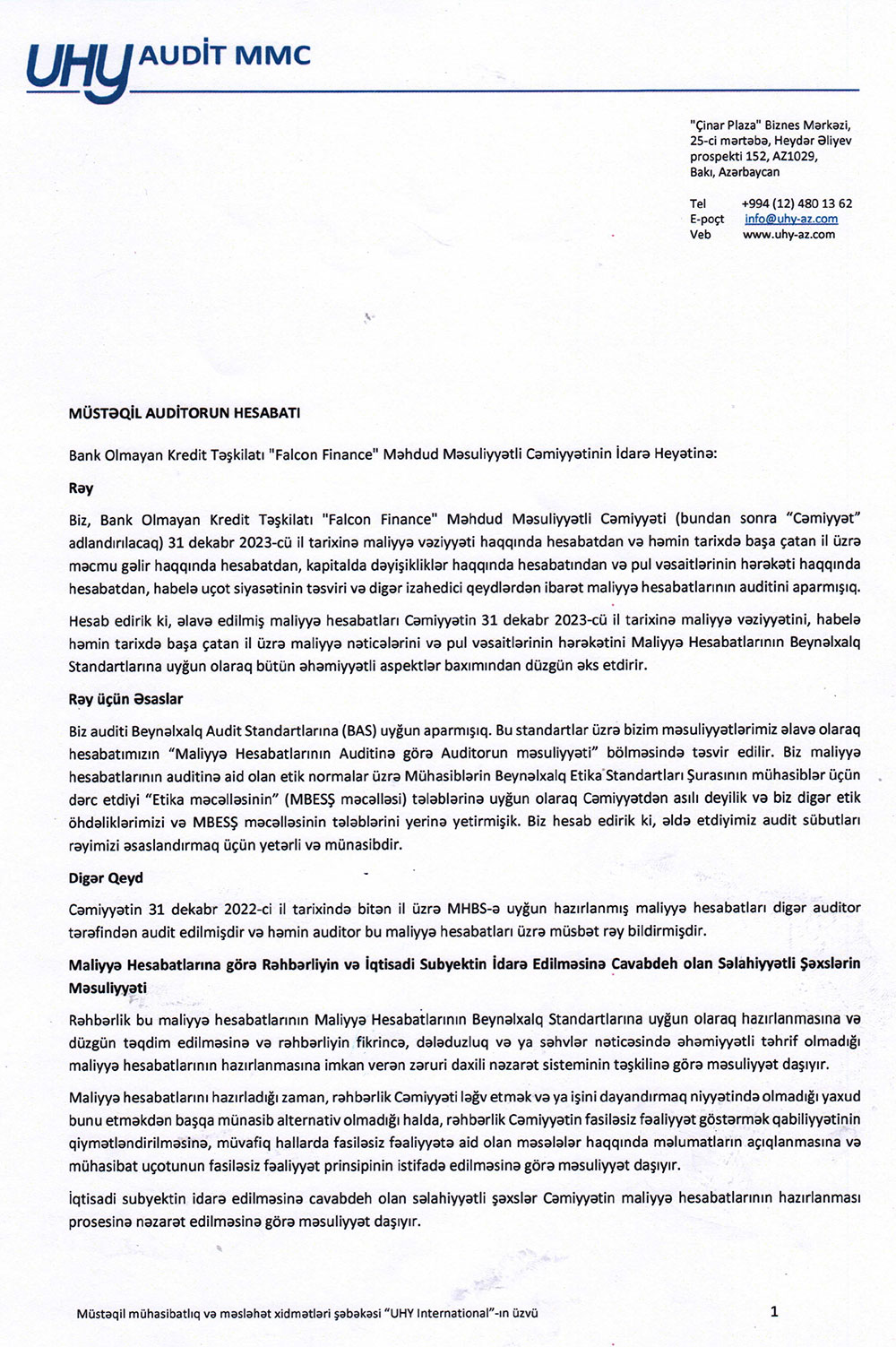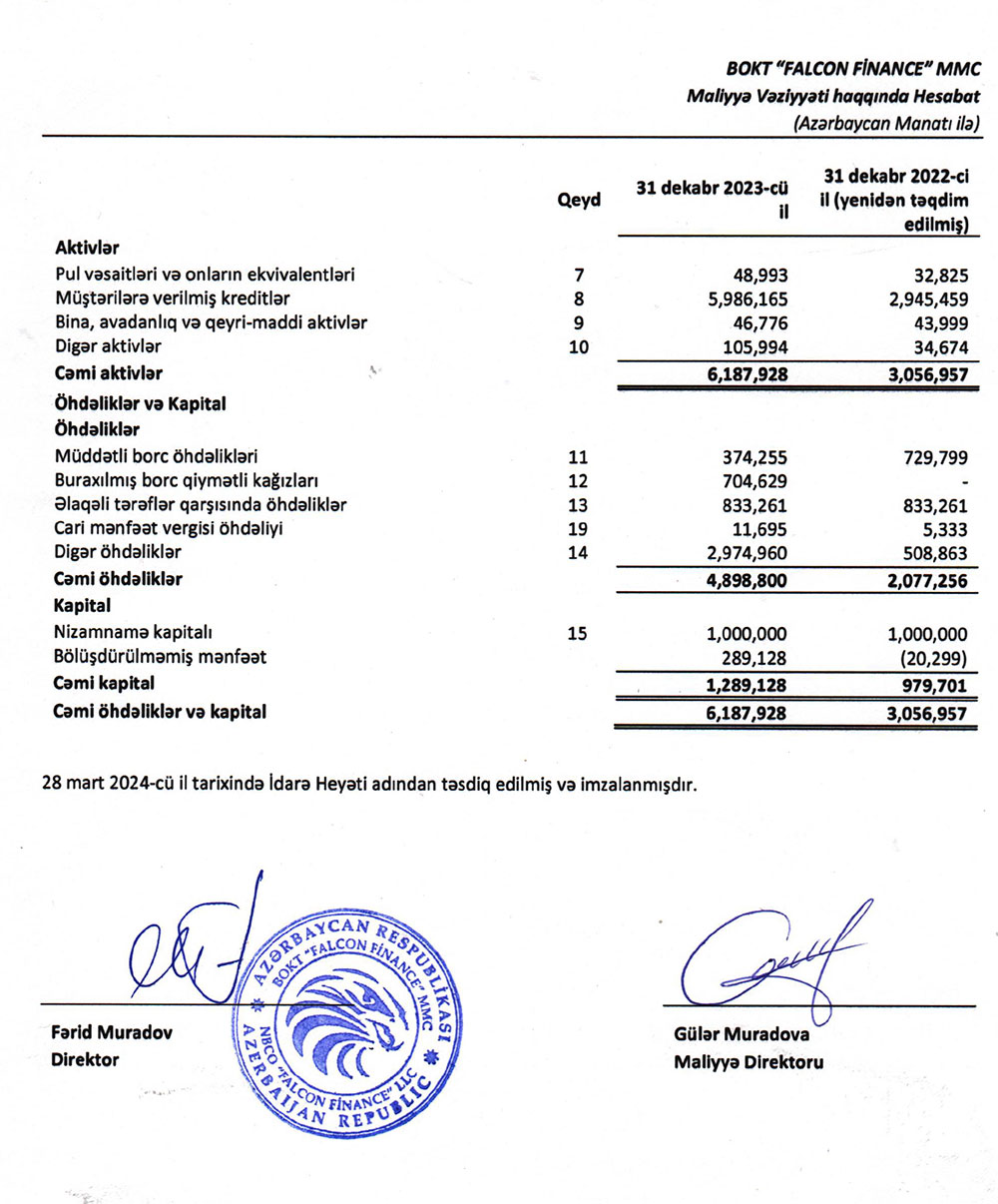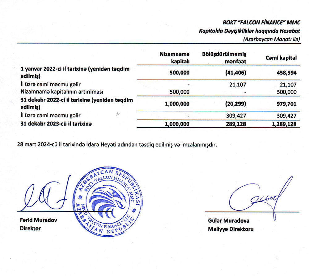 31 dekabr 2023-cü il tarixində BOKT “Falcon Finance” 1 milyon manat nizamnamə kapitalına malik olub.