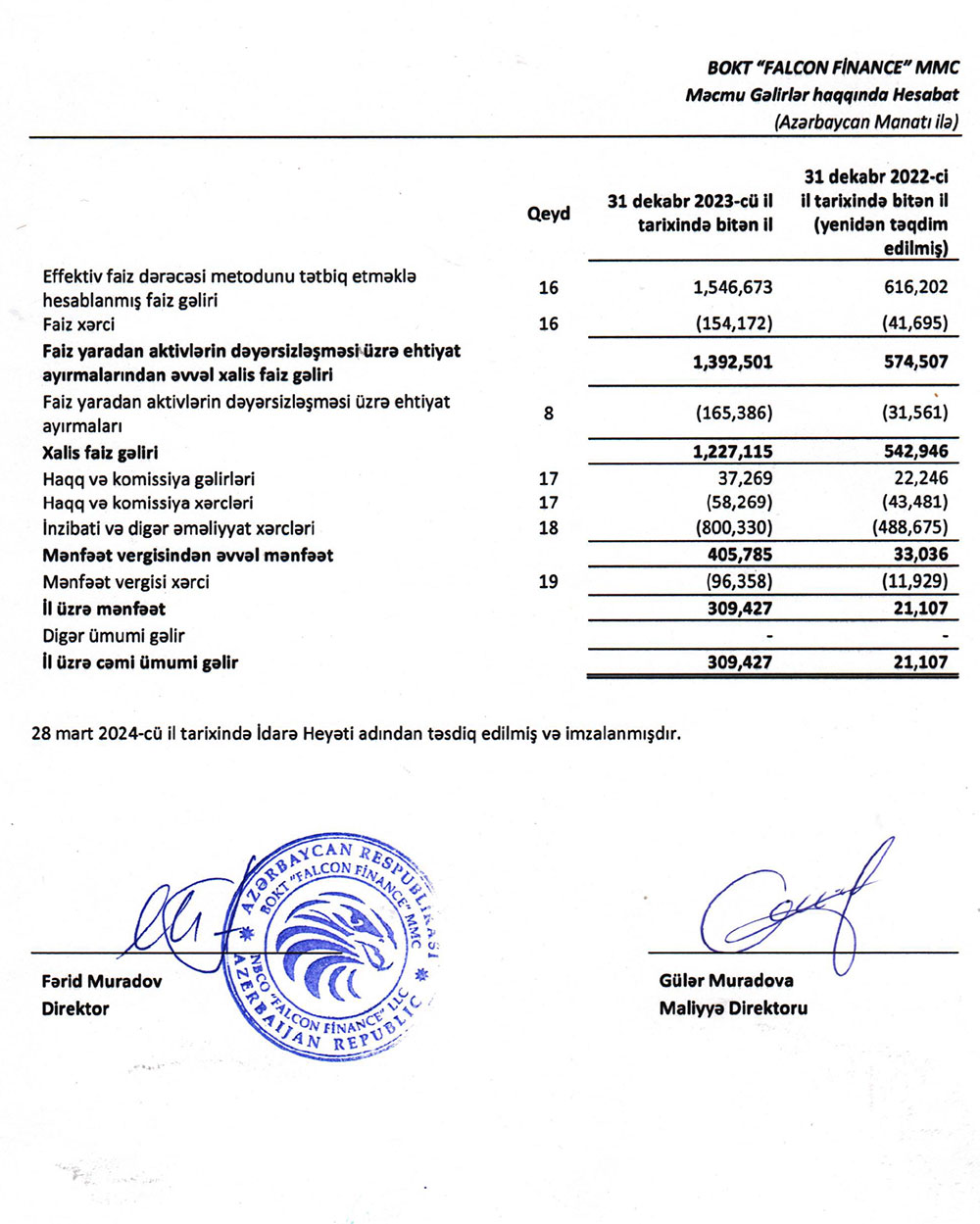 Marja.az Təşkilatın 31.12.2023-cü il tarixinə Maliyyə Hesabatları və Müstəqil Auditorların hesabatına istinadən xəbər verir ki, ötən il BOKT “Falcon Finance”ın faiz gəlirləri 2,5 dəfə artaraq 1 milyon 546 min 673 manata yüksəlib. Təşkilat 2022-ci ildə 616 min 202 manat faiz gəlirləri əldə etmişdi. Keçən il BOKT “Falcon Finance”ın haqq və komissiya gəlirləri isə 67,5% artaraq 37 min 269 manat təşkil edib. Gəlirlərin də artması Təşkilatın kredit portfelinin (müştərilərə verilmiş kreditlər) artması ilə əlaqədardır.