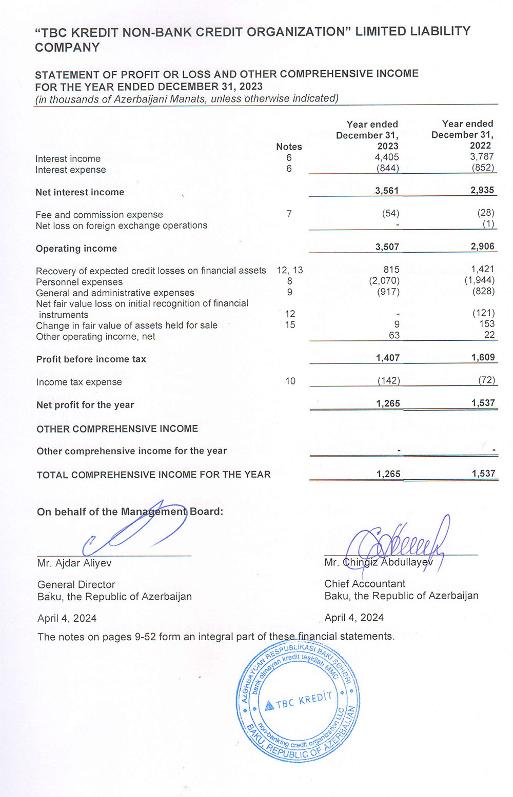 "TBC Kredit" Bank Olmayan Kredit Təşkilatı 2023-cü ili 1 milyon 265 min manat xalis mənfəət ilə başa vurub. Təşkilat 2022-ci ili 1 milyon 537 min manat xalis mənfəət ilə bağlamışdı. Beləliklə, "TBC Kredit"in xalis mənfəəti 2023-cü ildə 2022-ci illə müqayisədə 272 min manat və ya 17,7% azalıb. Xalis mənfəətin azalması xərclərin artması, əsasən də maliyyə aktivləri üzrə gözlənilən kredit itkilərinin bərpası üzrə ehtiyata ayırmanın daha böyük məbləğdə olması ilə əlaqədardır.