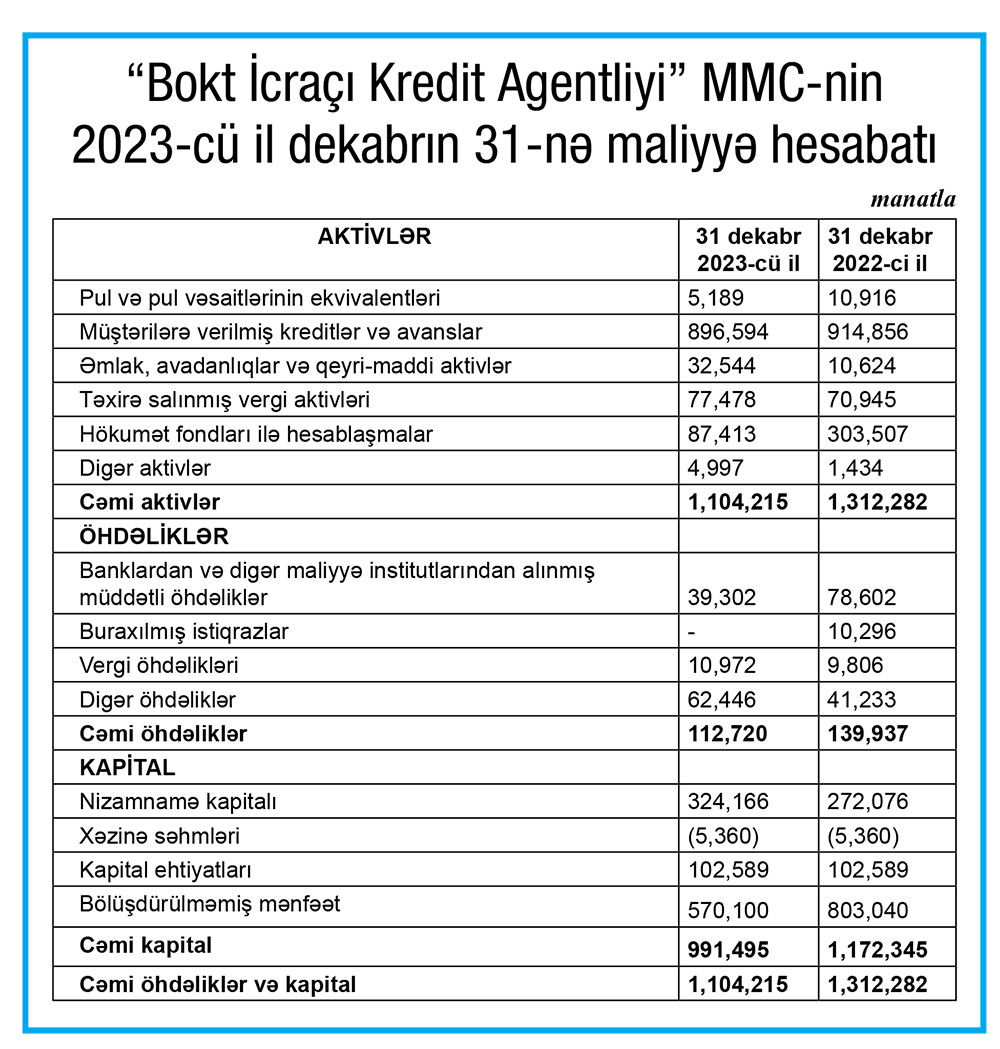 “BOKT İcraçı Kredit Agentliyi”nin 31 dekabr 2023-cü il tarixinə Mənfəət və zərər hesabatı dərc edilmədiyi üçün Təşkilatın gəlir və xərclərini öyrənmək mümkün olmayıb. Balans hesabatından görünür ki, ötən il “BOKT İcraçı Kredit Agentliyi”nin bölüşdürülməmiş mənfəəti 232 min 940 manat azalaraq 570 min 100 manata düşüb.