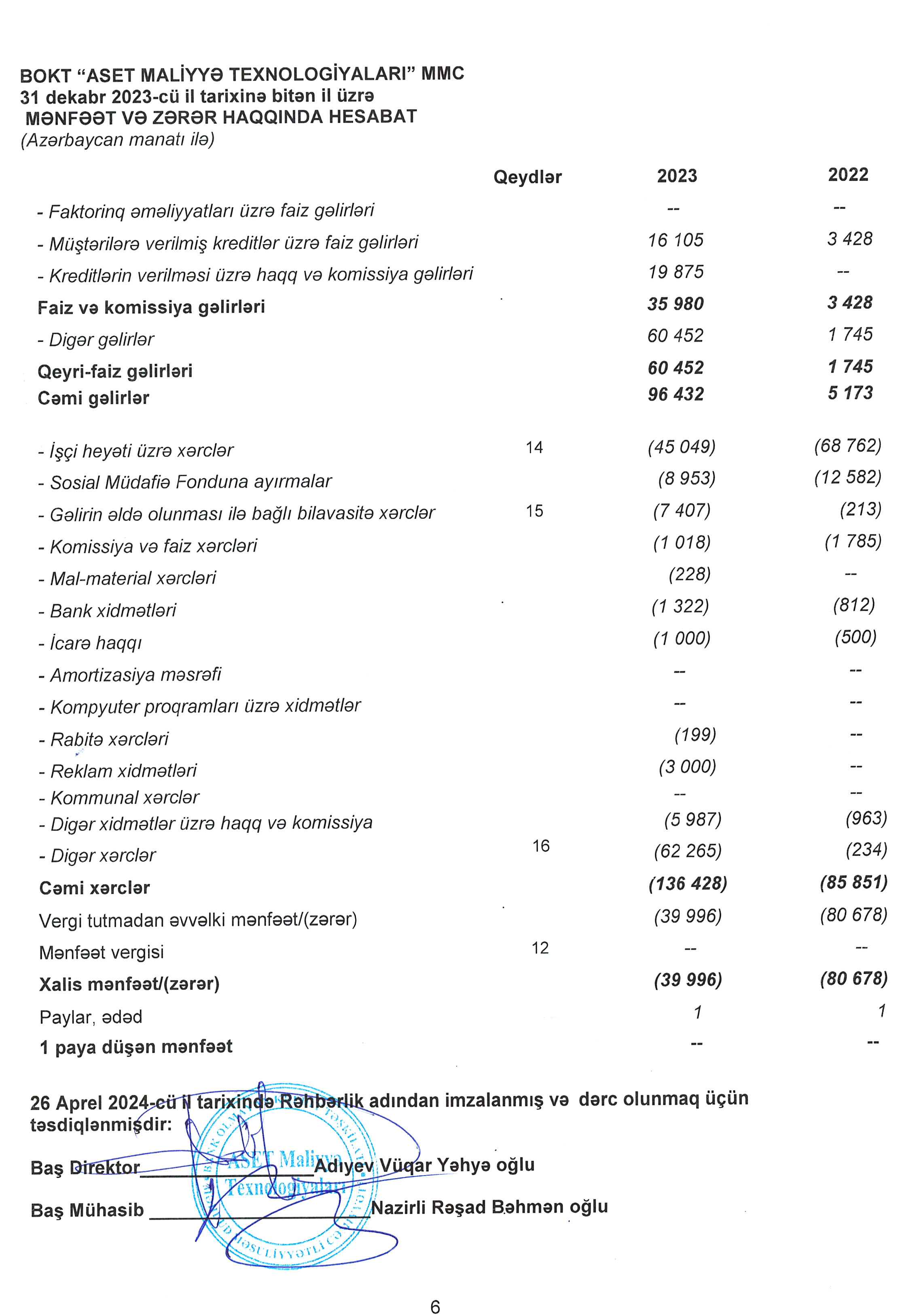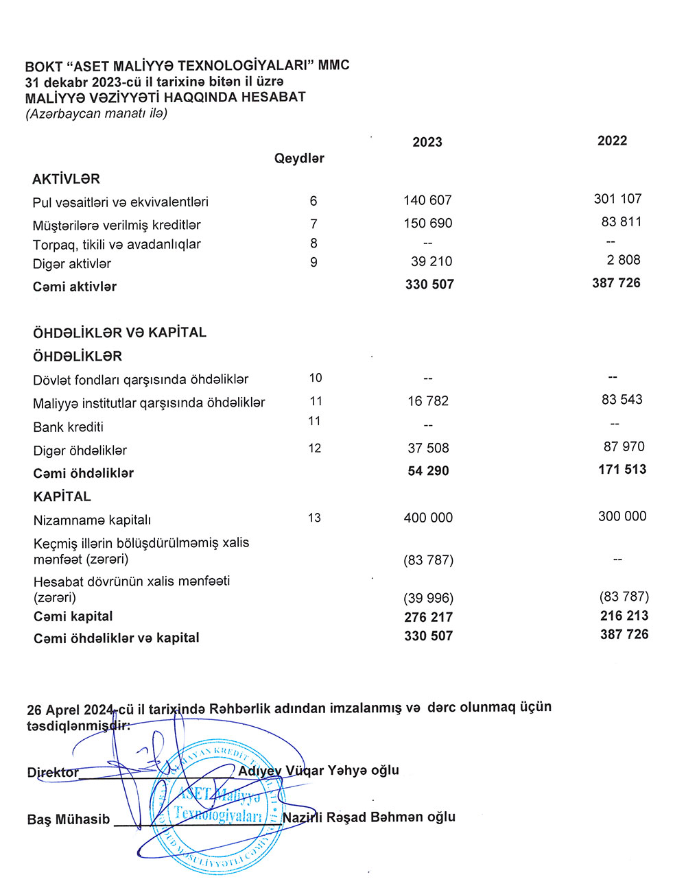 Bank Olmayan Kredit Təşkilatı “ASET Maliyyə Texnologiyaları” MMC 2023-cü ili 40 min manata yaxın xalis zərər ilə başa vurub. Təşkilat 2022-ci ili 81 min manat xalis zərər ilə bağlamışdı. Zərərin azalması gəlirlərin artması ilə əlaqədardır.