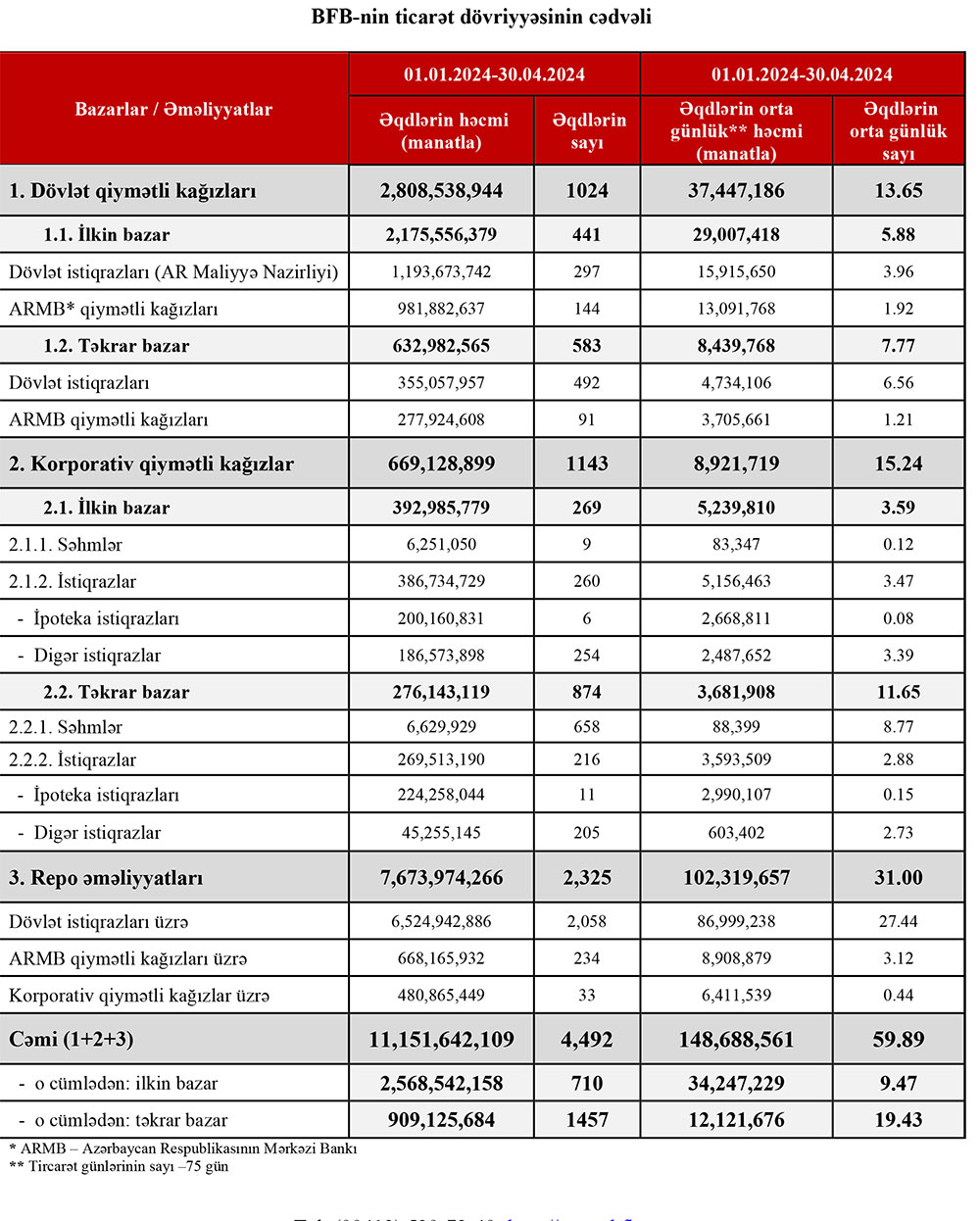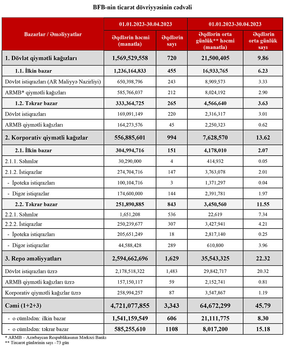2024-cü ilin ilk 4 ayı ərzində (yanvar-aprel) Azərbaycan Respublikası Maliyyə Nazirliyi dövlət istiqrazlarının yerləşdirilməsi yolu ilə Bakı Fond Birjası üzərindən daxili bazardan 1 milyard 193 milyon 674 min manat cəlb edib.