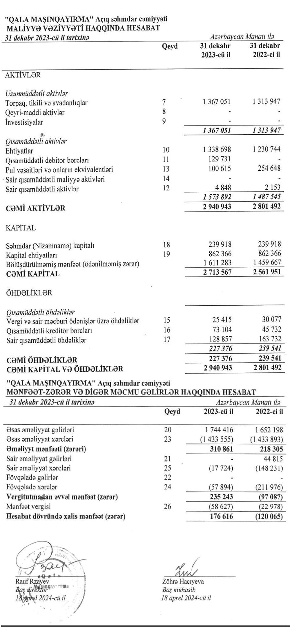 "Qala Maşınqayırma" ASC 2023-cü ili 177 min manat xalis mənfəət ilə başa vurub. ASC 2022-ci ili 120 min manat xalis zərər ilə bağlamışdı.