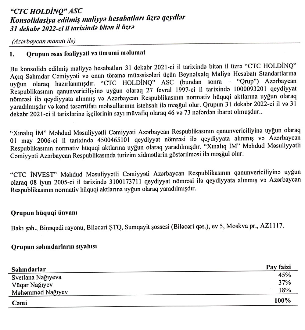 "CTC Holdinq" ASC-nin səhmdarları Svetlana Nağıyeva (45%), Vüqar Nağıyev (37%) və Məhəmməd Nağıyev (18%)