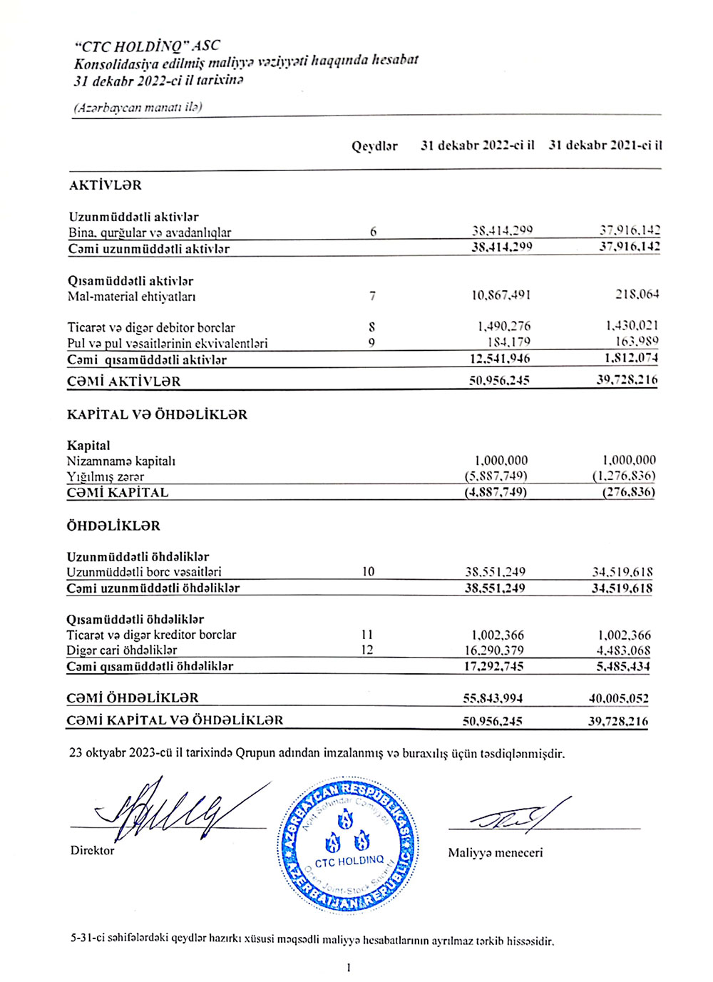 "CTC Holdinq"in cəmi aktivləri 2022-ci ildə 11 milyon 228 min manat artaraq 31 dekabr 2022-ci il tarixində 50 milyon 956 min manat təşkil edib.