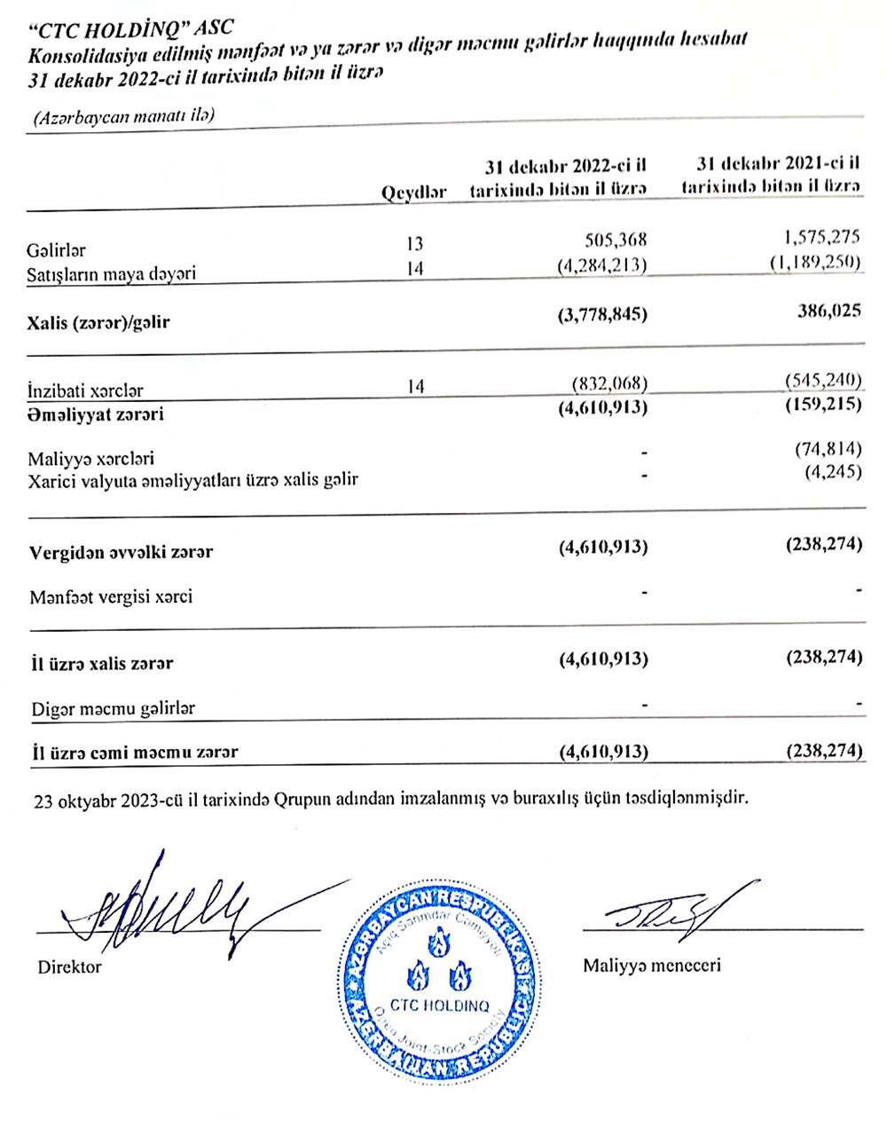Müxtəlif sahələrdə fəaliyyət göstərən şirkətlər qrupu olan "CTC Holdinq" ASC 2022-ci ili 4 milyon 611 min manat xalis zərər ilə başa vurub. Şirkətlər qrupu 2021-ci ili 238 min manat xalis zərər ilə bağlamışdı. Beləliklə,"CTC Holdinq"in xalis zərəri 2022-ci ildə 2021-ci illə müqayisədə 19,4 dəfə artıb.