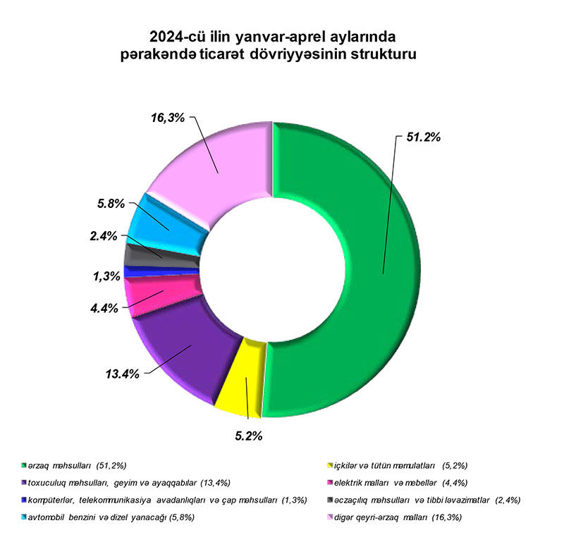 Hesabat dövründə alıcıların pərakəndə ticarət şəbəkəsində aldıqları mallara xərclədiyi vəsaitin 51,2 faizi ərzaq məhsullarının, 5,2 faizi içkilər və tütün məmulatlarının, 13,4 faizi toxuculuq məhsulları, geyim və ayaqqabıların, 5,8 faizi avtomobil benzini və dizel yanacağının, 4,4 faizi elektrik malları və mebellərin, 2,4 faizi əczaçılıq məhsulları və tibbi ləvazimatların, 1,3 faizi kompüterlər, telekommunikasiya avadanlıqları və çap məhsullarının, 16,3 faizi isə digər qeyri-ərzaq mallarının alınmasına sərf olunmuşdur.