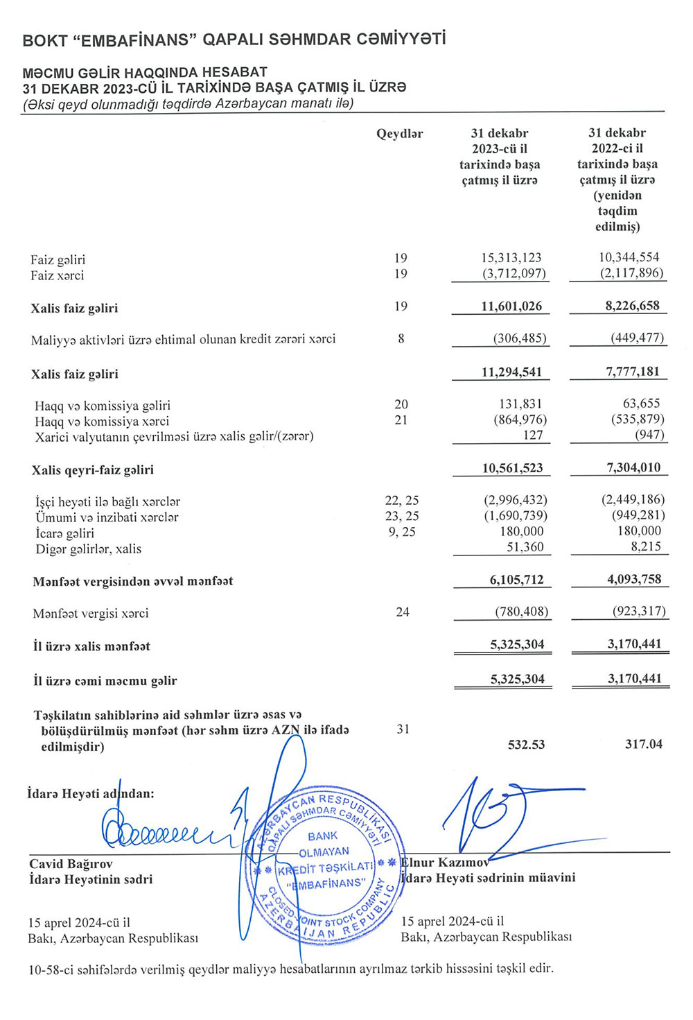 Bank Olmayan Kredit Təşkilatı "EmbaFinans" Qapalı Səhmdar Cəmiyyəti 2023-cü ili 5 milyon 325 min manat xalis mənfəət ilə başa vurub. Təşkilat 2022-ci ili 3 milyon 170 min manat xalis mənfəət ilə bağlamışdı. Beləliklə, ötən il "EmbaFinans"ın xalis mənfəəti 2 milyon 155 min manat və ya 68% artıb.