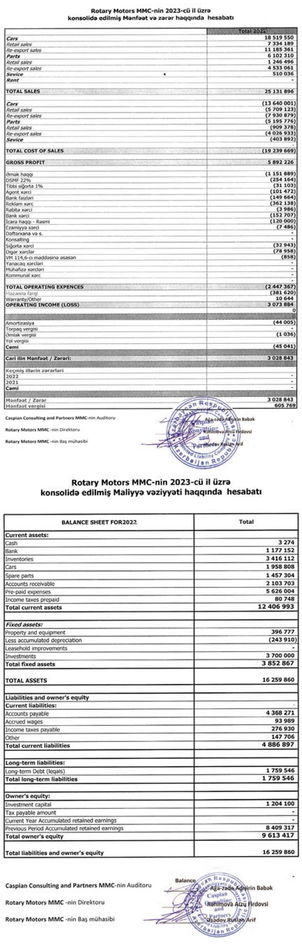 Ötən il “Rotary Motors” avtomobillərin ehtiyat hissələrinin satışından 6 milyon 102 min manat, servis xidmətlərindən 510 min manat gəlir götürüb. 2022-ci ildə Şirkət avtomobillərin ehtiyat hissələrinin satışından 4 milyon 519 min manat, servis xidmətlərindən 530 min manat gəlir əldə etmişdi. “Rotary Motors” şirkətinin ehtiyat hissələrinin yenidən ixracından illik gəliri 2022-ci ildəki 2 milyon 844 min manatdan 2023-cü ildə 4 milyon 533 min manata yüksəlib.