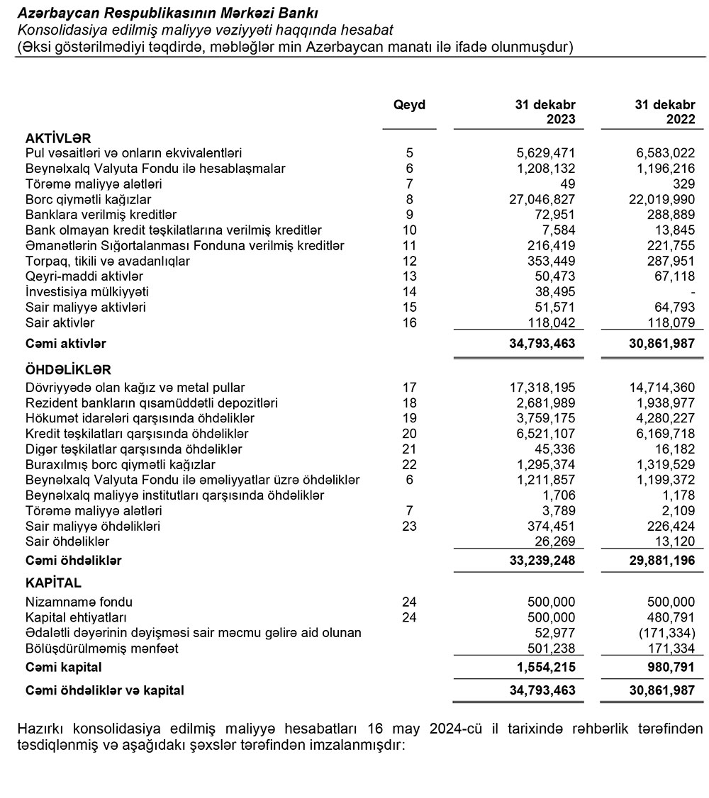 Azərbaycan Mərkəzi Bankının (AMB) 2023-cü ilə dair konsolidasiya olunmuş maliyyə hesabatları açıqlanıb.