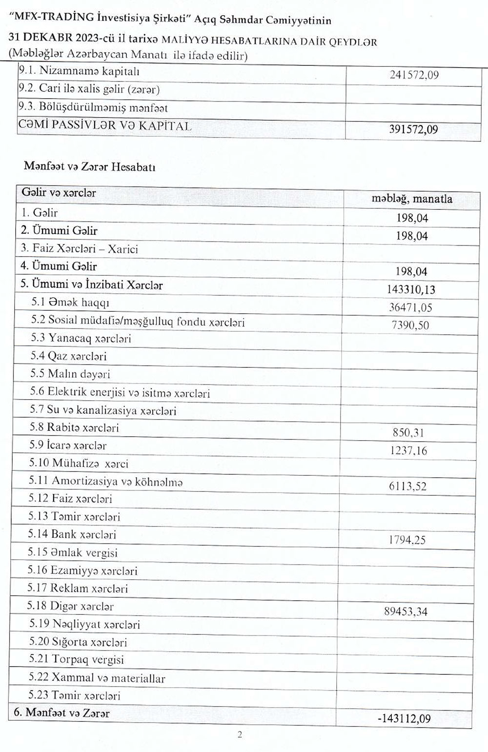 “MFX-Trading İnvestisiya Şirkəti" ASC 2023-cü ili 143 min 112 manat xalis zərər ilə başa vurub.