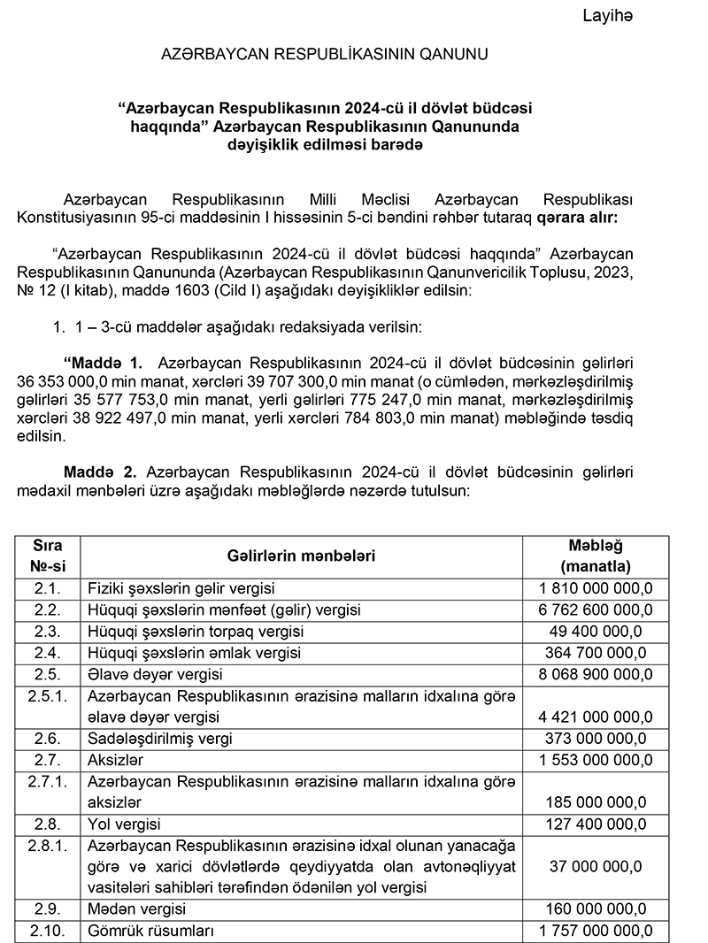Yenidən baxılma ilə 2024-cü il dövlət büdcəsində gəlirlər 36 milyard 353 milyon manat proqnozlaşdırılır ki, bu da təsdiq olunmuş göstəriciyə nisbətən 2 milyard 180 milyon manat və ya 6,4 faiz çoxdur.