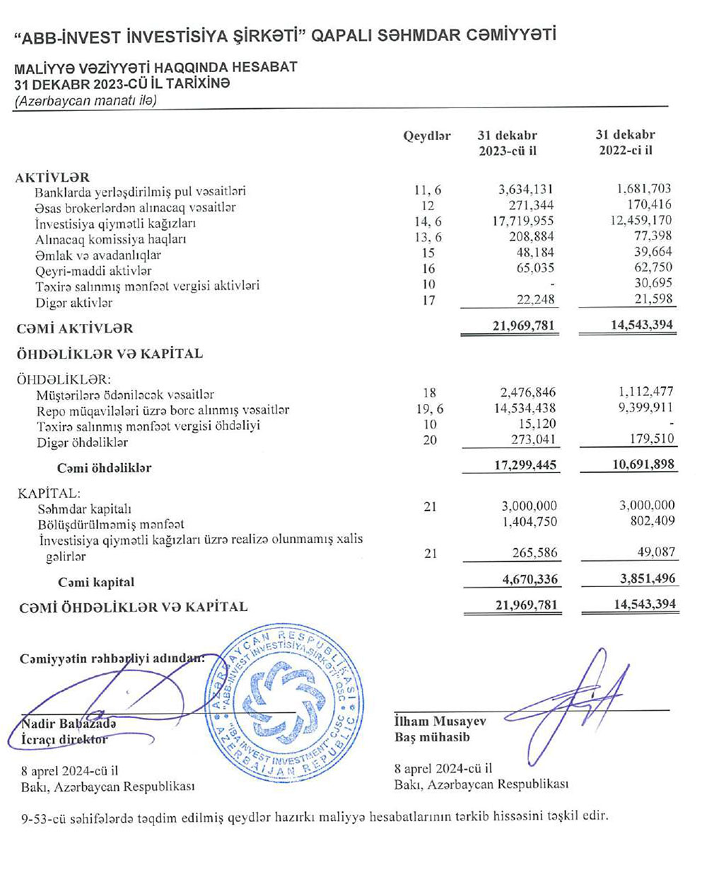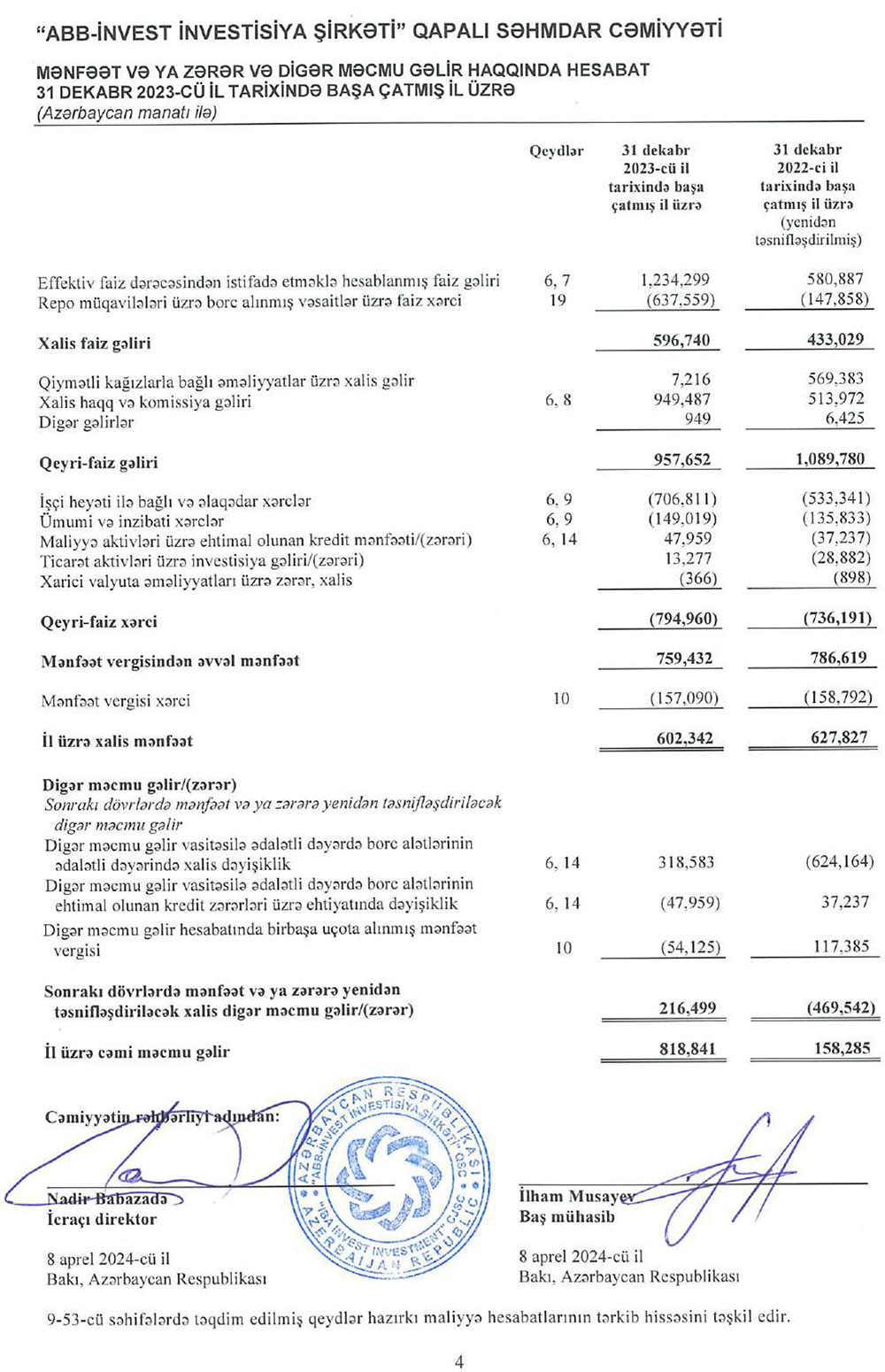 Marja.az xəbər verir ki, QSC-nin 31 dekabr 2023-cü il tarixində başa çatmış il üzrə Maliyyə Hesabatlarının Beynəlxalq Standartlarına uyğun hazırlanmış Maliyyə Hesabatlarına istinadən xəbər verir ki, "ABB İnvest İnvestisiya Şirkəti"nin faiz gəlirləri 2022-ci ildə 581 min manat ikən, 2023-cü ildə 1 milyon 234 min manat təşkil edib (2,1 dəfə artıb). Qeyri-faiz gəlirləri isə 2022-ci ildəki 1 milyon 90 min manatadan 2023-cü ildə 958 min manata düşüb.