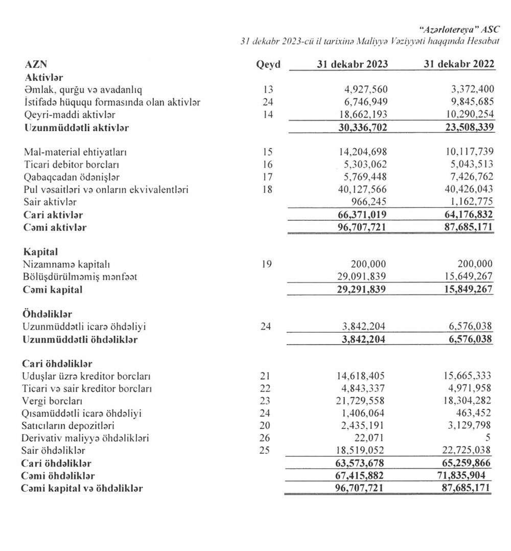 2023-cü il ərzində şirkət 6,8 milyon manat məbləğində investisiya edərək uzunmüddətli aktivlərini 23,5 milyon manatdan 30,3 milyon manata yüksəldib. O cümlədən, “Azərlotereya”nın 2023-cü ilin sonu cəmi aktivləri 96,7 milyon manat təşkil edib. Şirkətin 2022-ci ilin sonunda cəmi aktivləri 87,7 milyon manat olub.