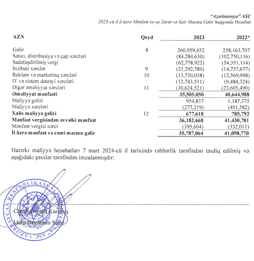 Ölkənin qanuni lotereya təşkilatçısı və idman mərc oyunları operatoru - “Azərlotereya” ASC 2023-cü il üzrə maliyyə hesabatını təqdim edib.