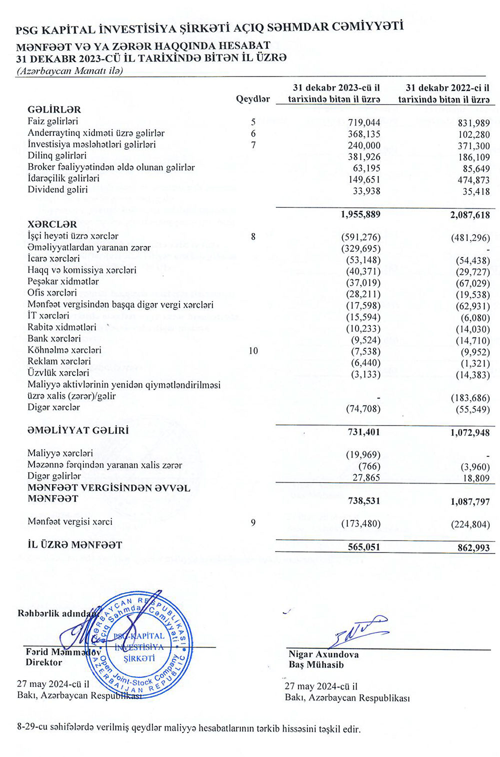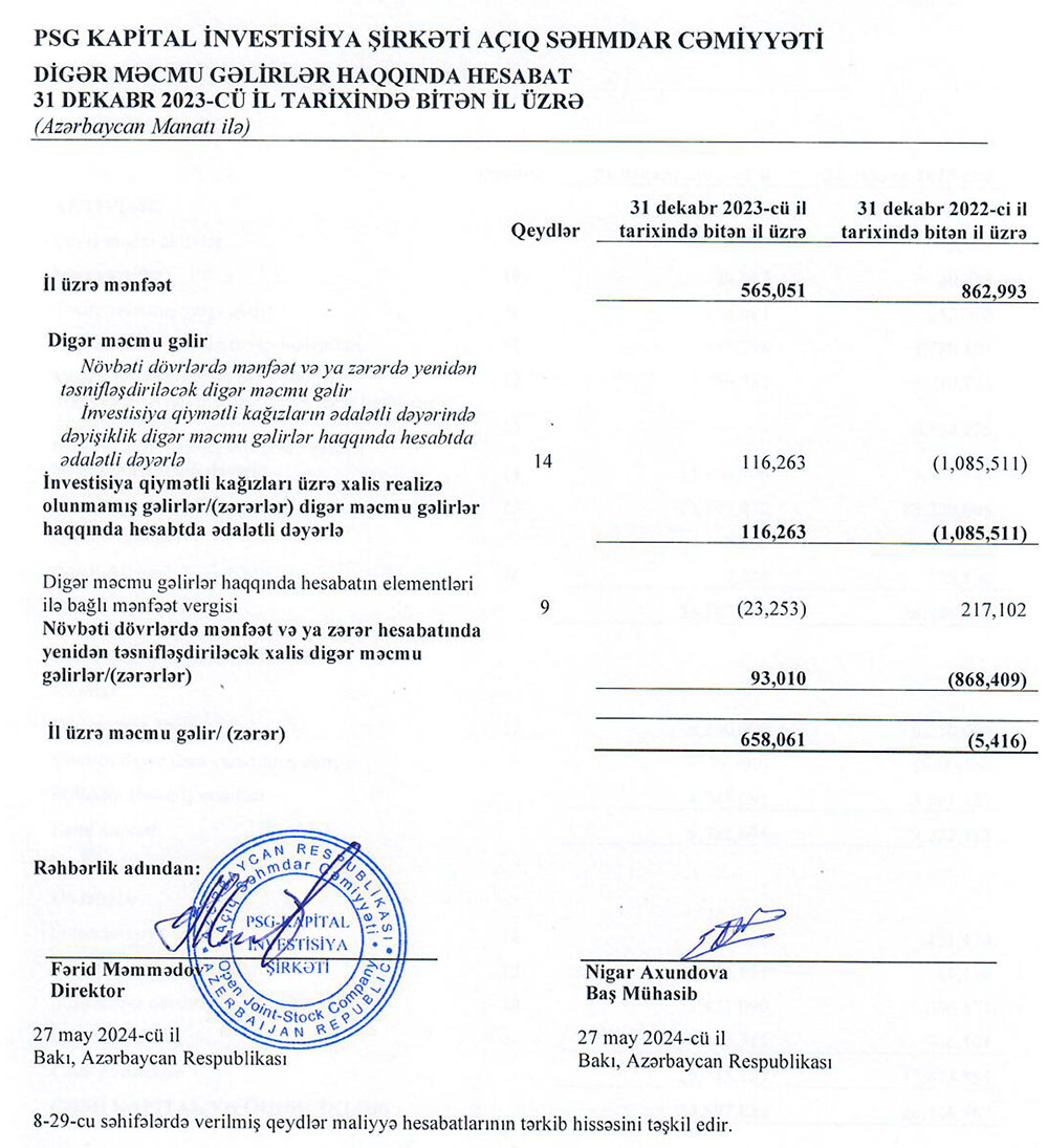 "PSG Kapital İnvestisiya Şirkəti" ASC 2023-cü ili 565 min manat xalis mənfəət ilə başa vurub. Şirkət 2022-ci ili 863 min manat xalis mənfəət ilə bağlamışdı.
