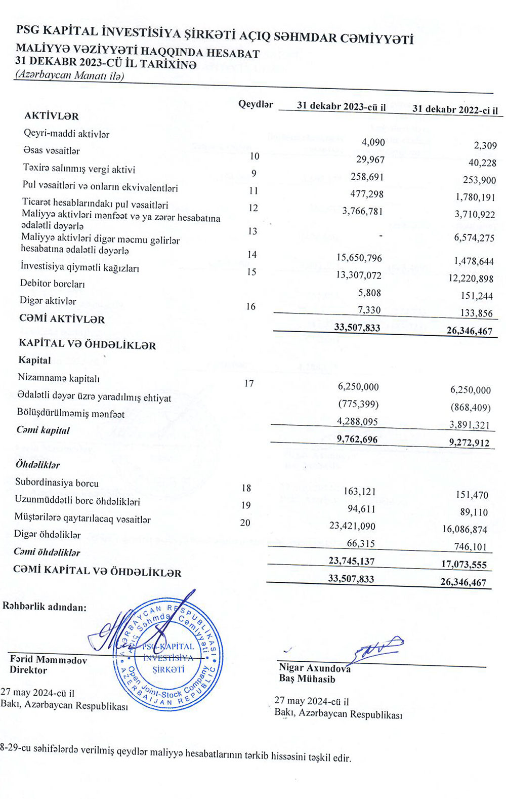 31 dekabr 2023-cü il tarixində "PSG Kapital İnvestisiya Şirkəti" ASC 33 milyon 508 min manat cəmi aktivlərə malik olub. Şirkət 2022-ci ilin sonunda 26 milyon 346 min manat cəmi aktivlərə malik idi.