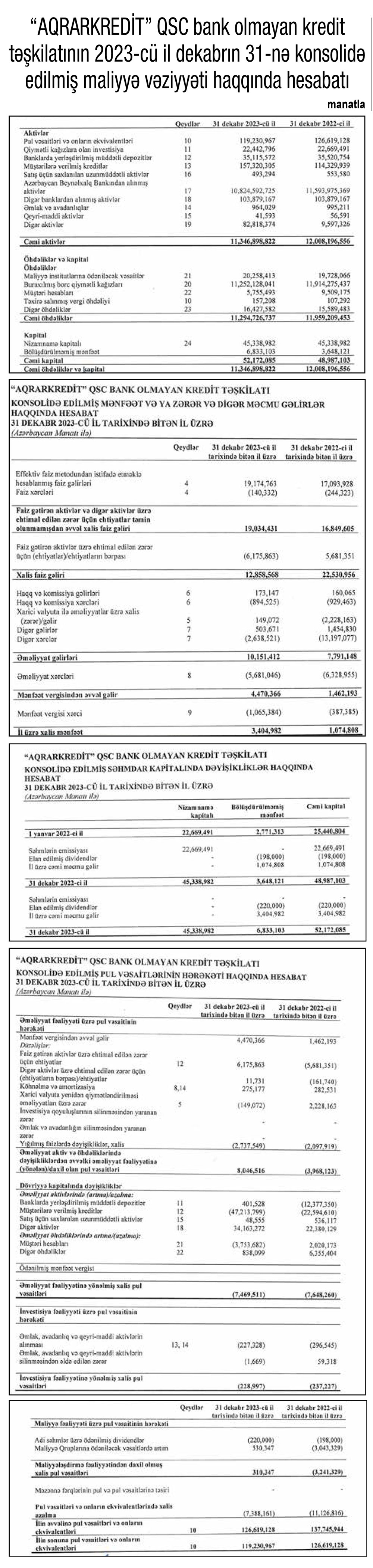 “Aqrarkredit” QSC bank olmayan kredit təşkilatı 2023-cü ili 3 milyon 405 min manat xalis mənfəət ilə başa vurub. Təşkilat 2022-ci ili 1 milyon 75 min manat xalis mənfəət ilə bağlamışdı. Beləliklə, “Aqrarkredit”in xalis mənfəəti 2023-cü ildə 2022-ci illə müqayisədə 3,2 dəfə və ya 2 milyon 330 min manat artıb.