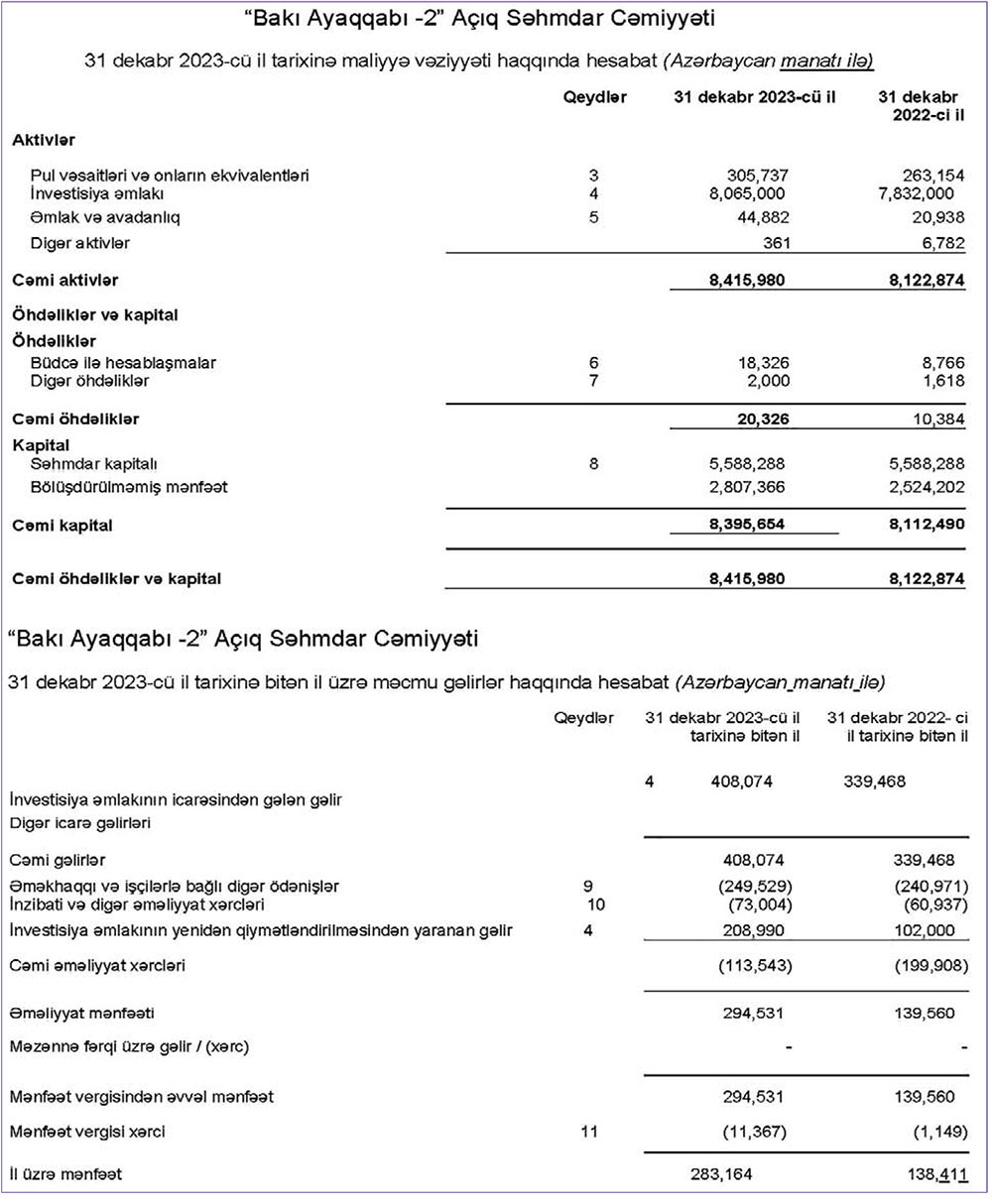 "Bakı Ayaqqabı-2" ASC 2023-cü ili 286 min 164 manat xalis mənfəət ilə başa vurub. Şirkət 2022-ci ili 138 min 411 manat xalis mənfəət ilə bağlamışdı.