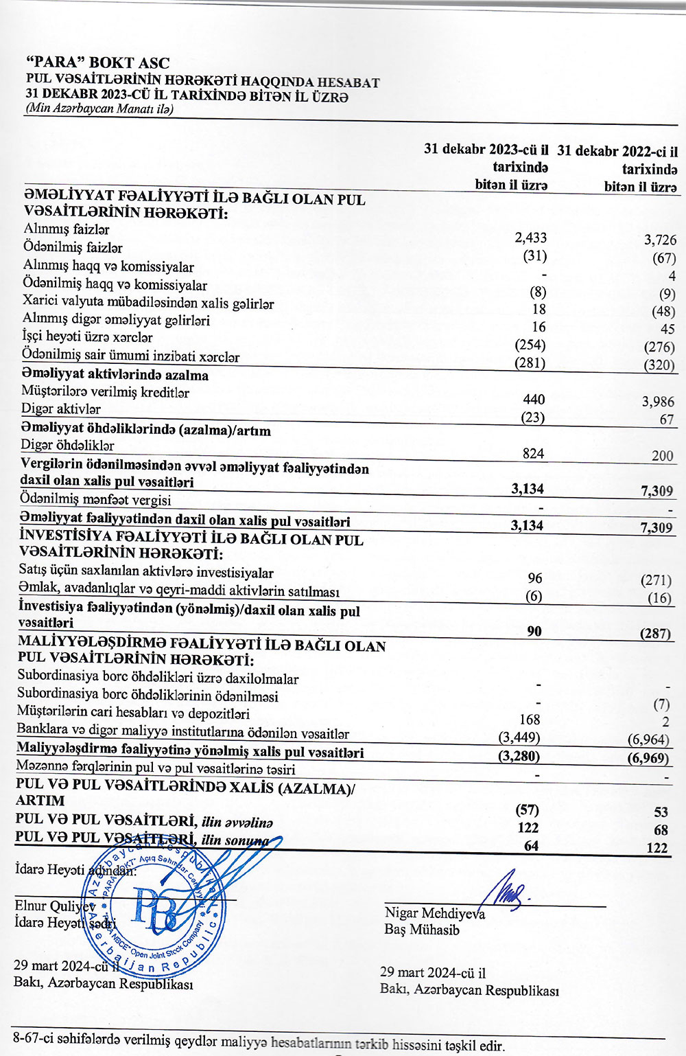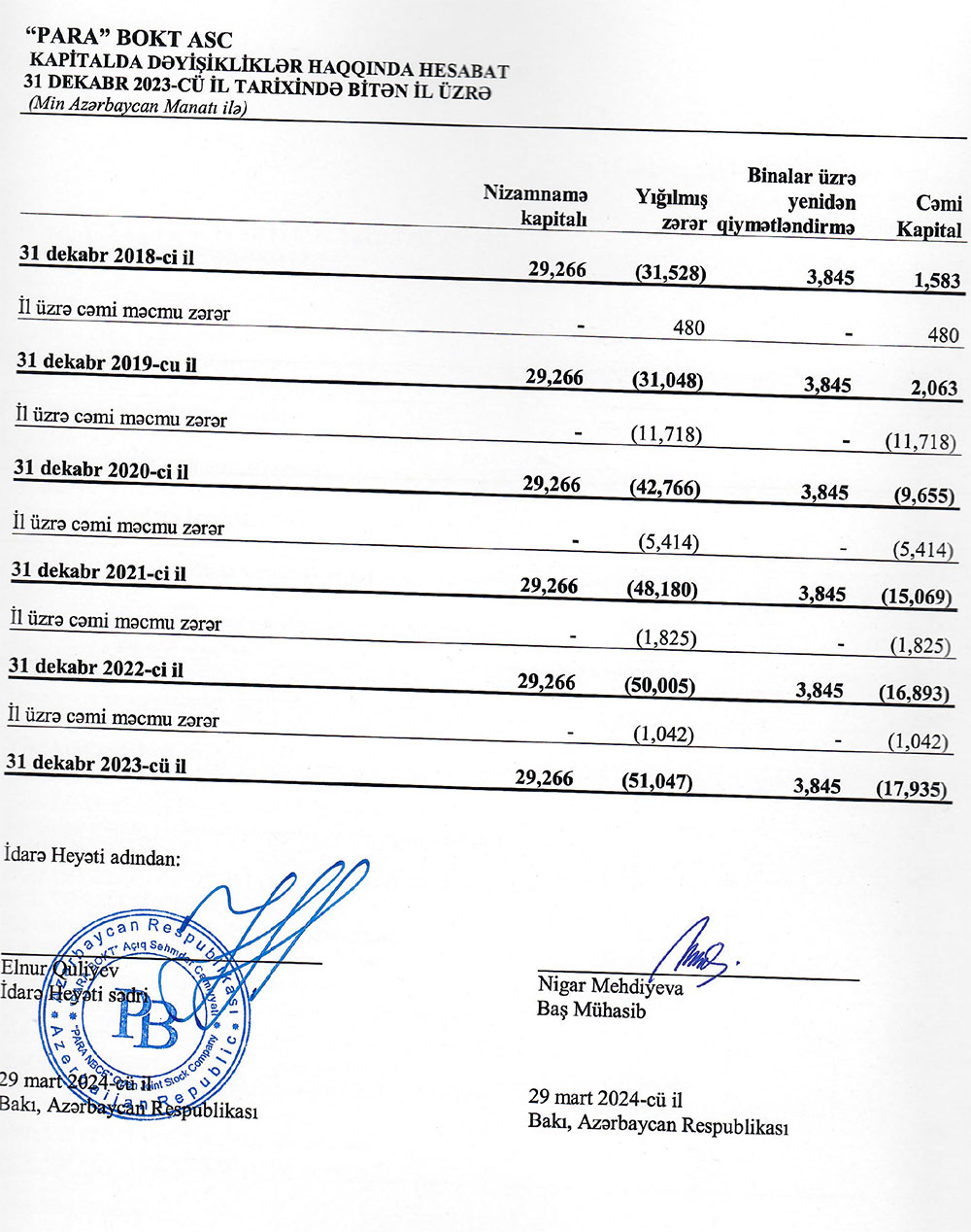 "PARA BOKT" ASC 31 dekabr 2023-cü il tarixində bitən il üzrə maliyyə hesabatlarını açıqlayıb.