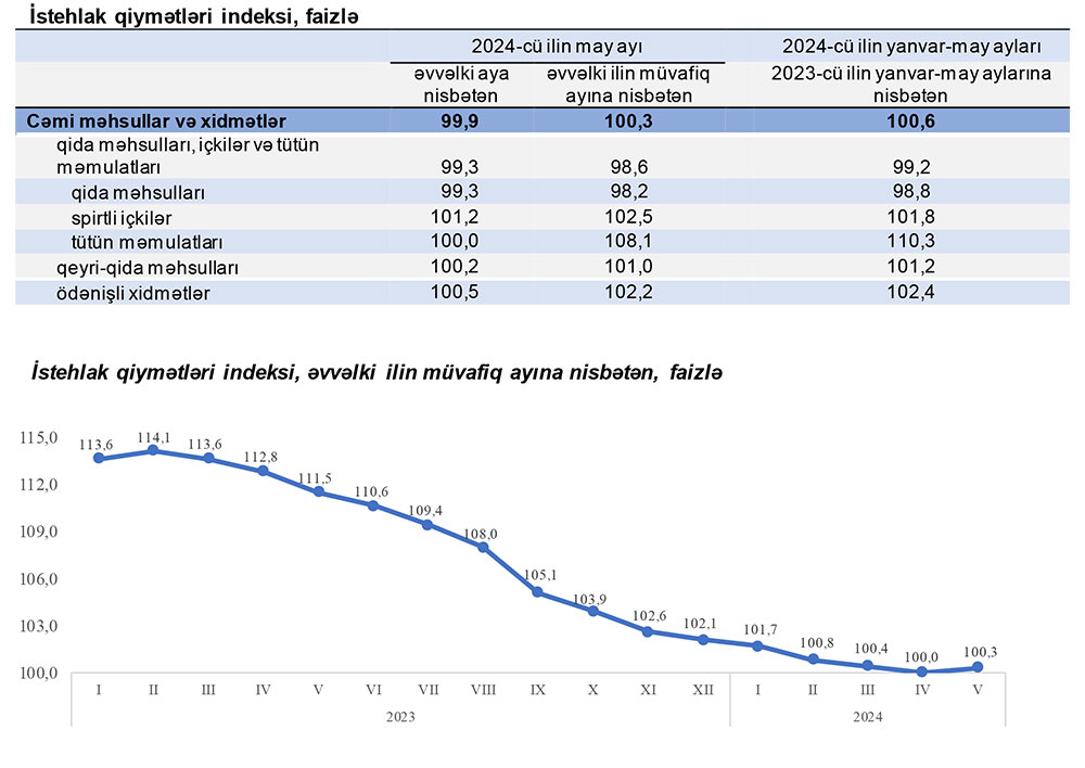 2024-cü ilin may ayında istehlak qiymətləri indeksi aprel ayına nisbətən 0,1 faiz azalıb. Yanvar-may aylarında isə əvvəlki ilin müvafiq dövrünə nisbətən 0,6 faiz artıb.