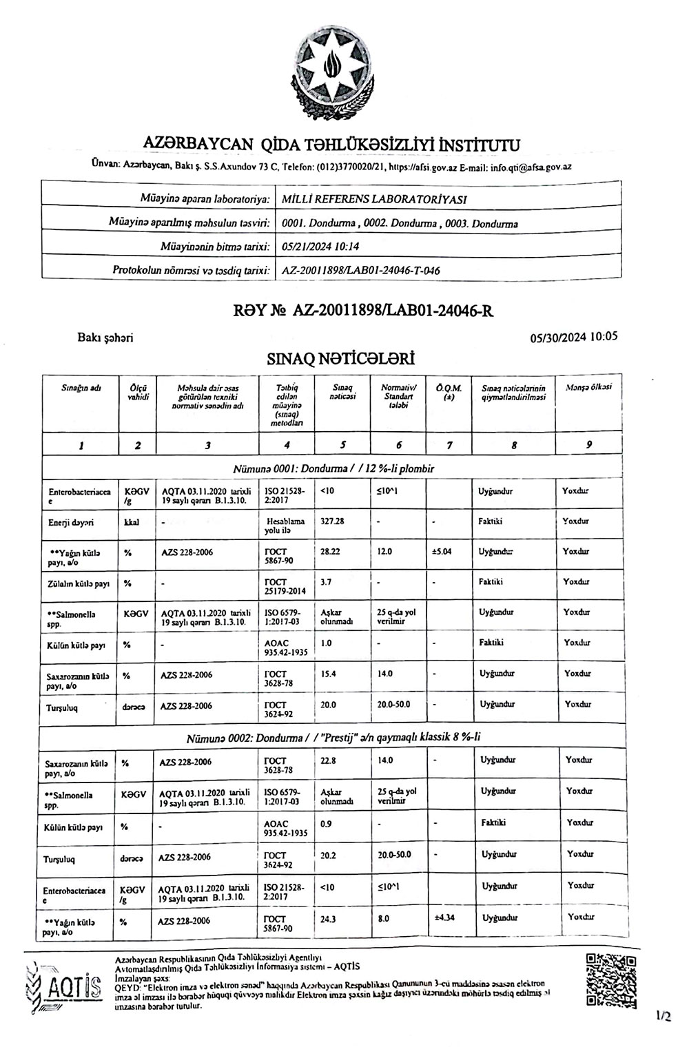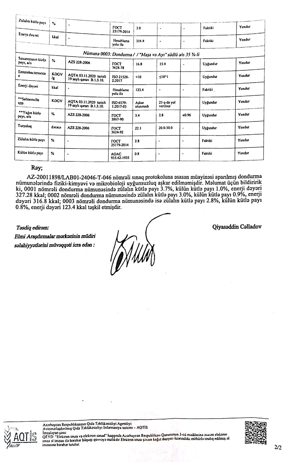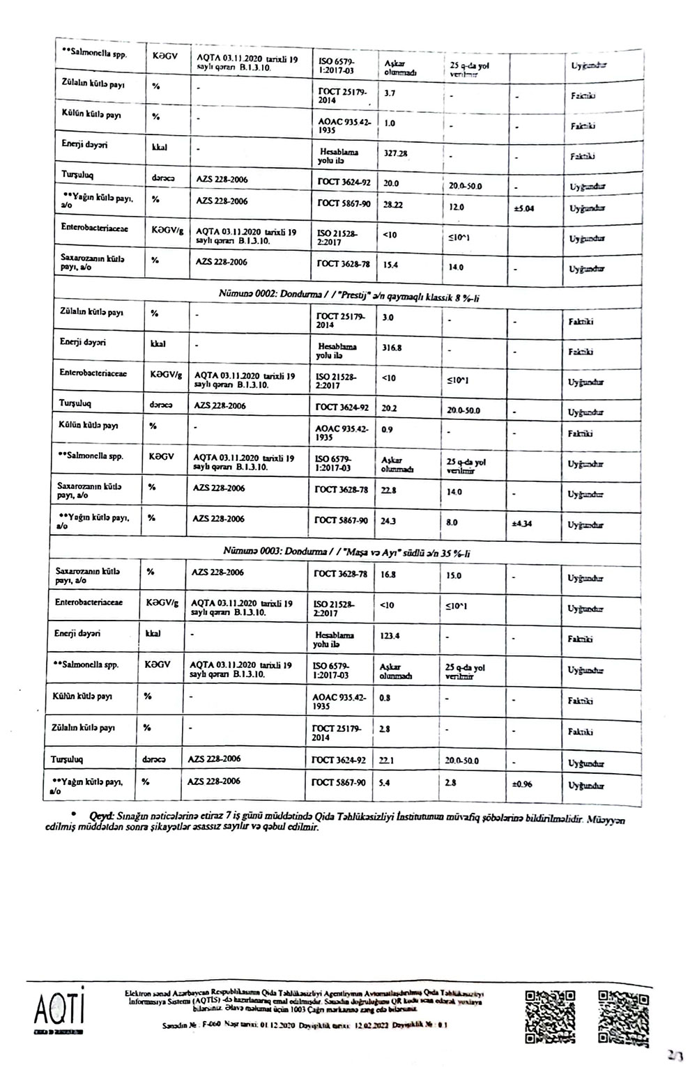 Eyni zamanda bildiririk ki, məhsullarımızın hazırlanması üçün istifadə etdiyimiz xammal mütləq şəkildə AQTA-nın laboratoriyalarında yoxlamadan keçirildikdən və müsbət nəticə alındıqdan sonra istehsalımızda istifadə edilir. O cümlədən, günlük hazırlanan hər məhsulun hər partiyasından nümunə götürülərək AQTA-nın laboratoriyasına göndərilir və uyğunluq cavabı gəldikdən sonra qablaşdırılır (Sınaq nəticələrindən nümunə əlavə olunur) Mövcud vəziyyətin səbəbləri bizim şirkətimiz tərəfindən də araşdırılmağa başlanmışdır, məhsulda bakteriyanın olması onun saxlanılma şəraitinə və ya daşınma zamanı yol verilən pozuntulardan qaynaqlana bilər. Bizim şirkətə məxsus avtomobillərlə daşınmış və şirkətə məxsus soyuducularımızda saxlanılan məhsullarda bu hal mümkün deyildir.