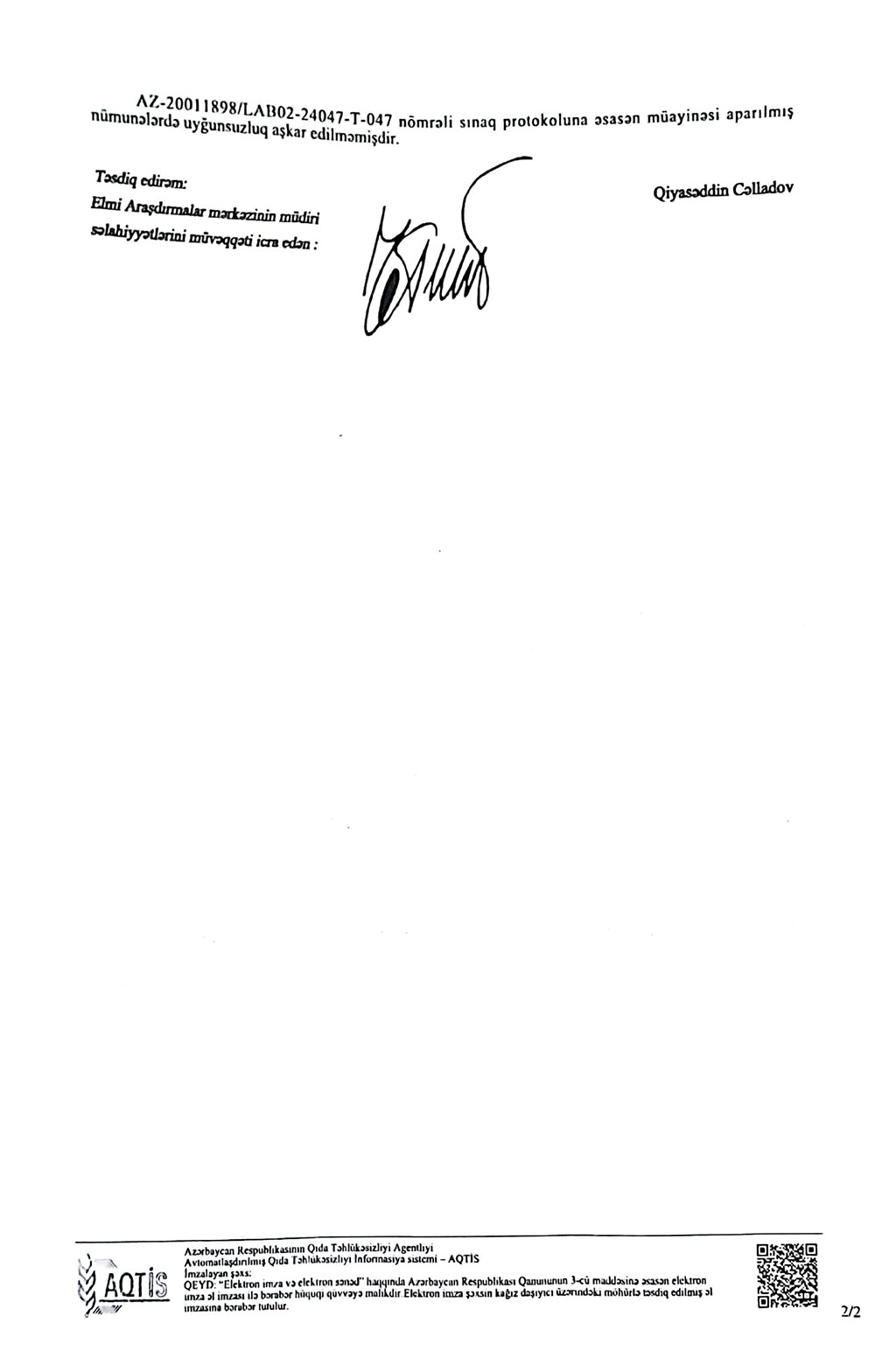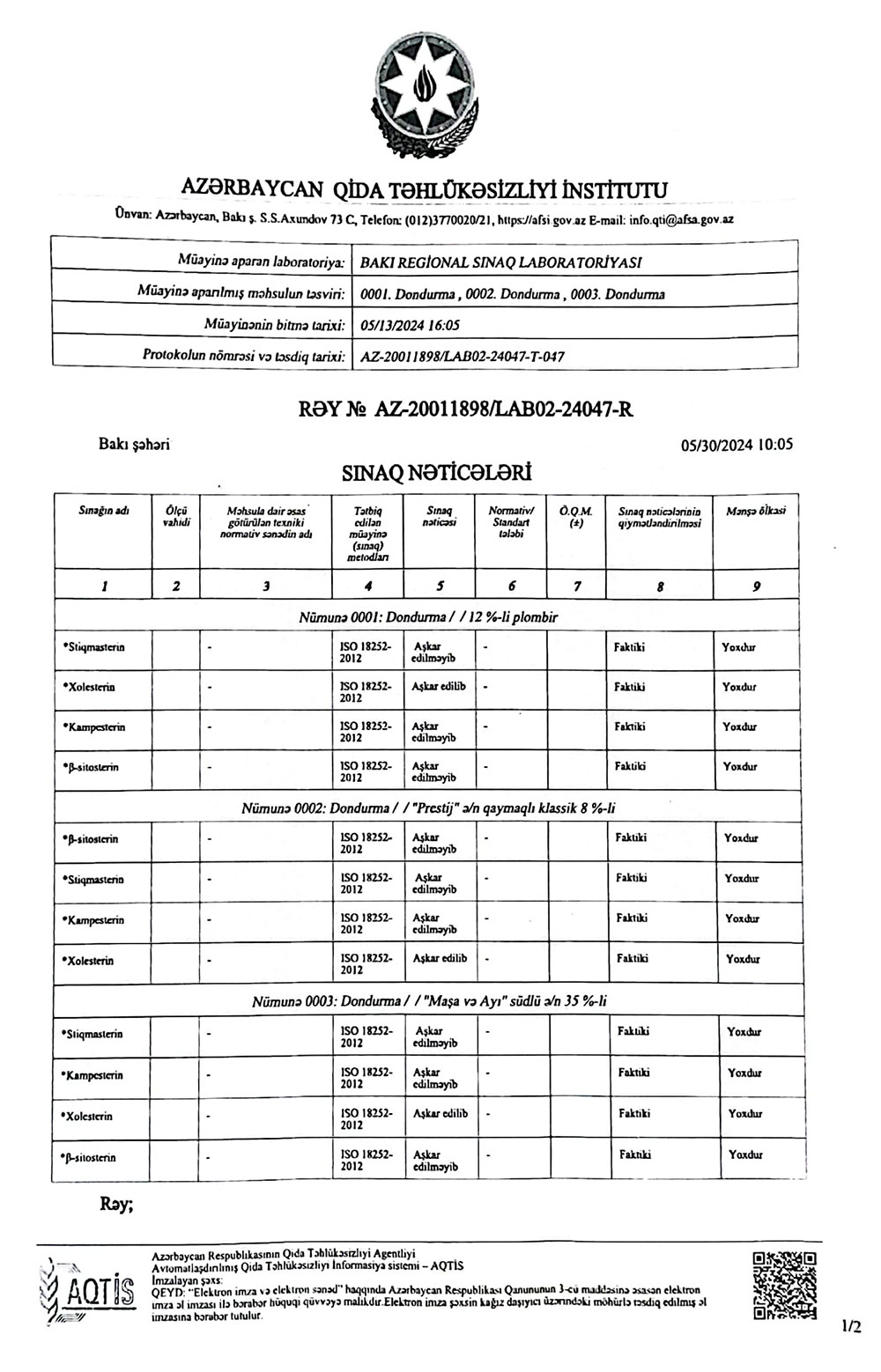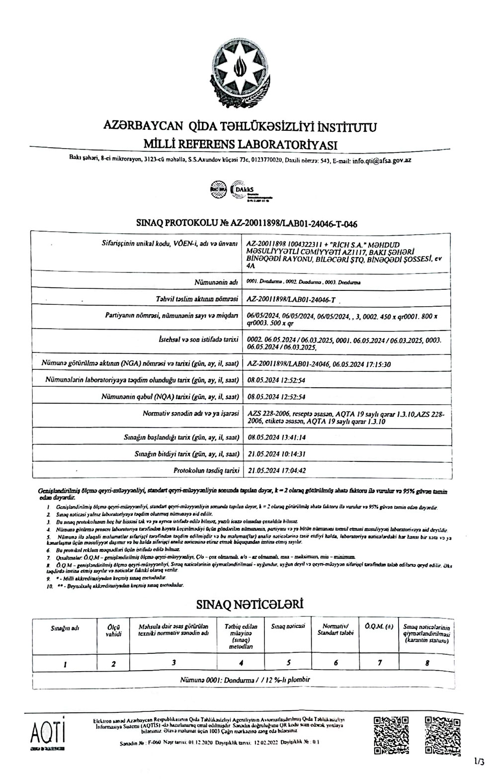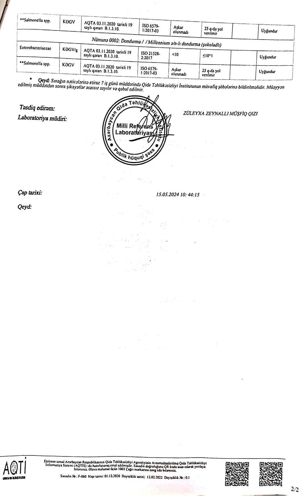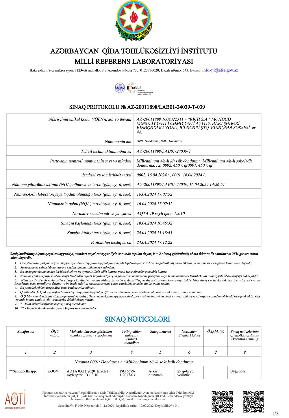 Mətbuatda adı çəkilən məhsullarımızda aşkar olunduğu bildirilən bakteriyanın məhsulumuzda olmasının qeyri-mümkün olduğunu qətiyyətlə bildiririk. Buna sübutumuz son on gün ərzində müəssisəmizdə yoxlamada olan AQTA nümayəndələrinin müəssisəmizin anbarından və istehsalat sahəsindən götürdükləri nümunələrin laboratoriya nəticələridir (AQTA-nın sınaq nəticələrini əlavə olunur). Nümunələrdən də göründüyü kimi müəssisəmizdə olan xammallarda, hazır məhsullarda və dəzgahlarda heç bir bakteriya aşkarlanmamışdır.